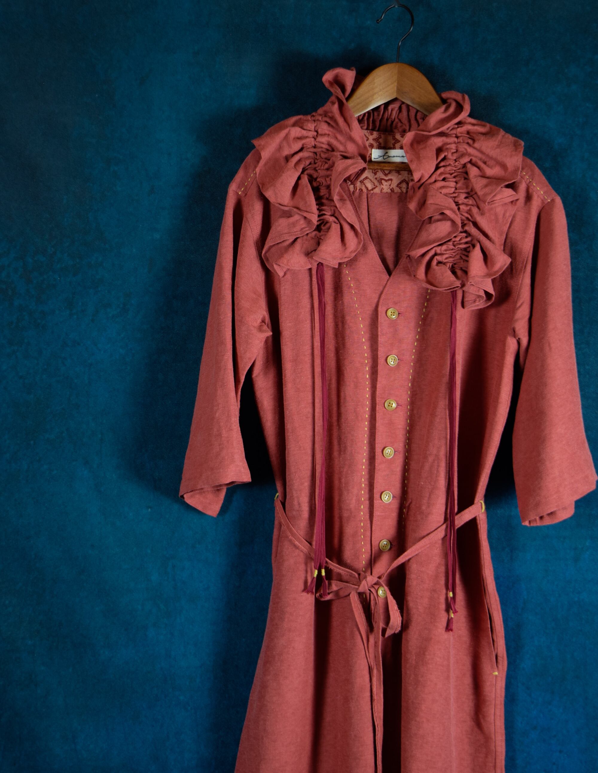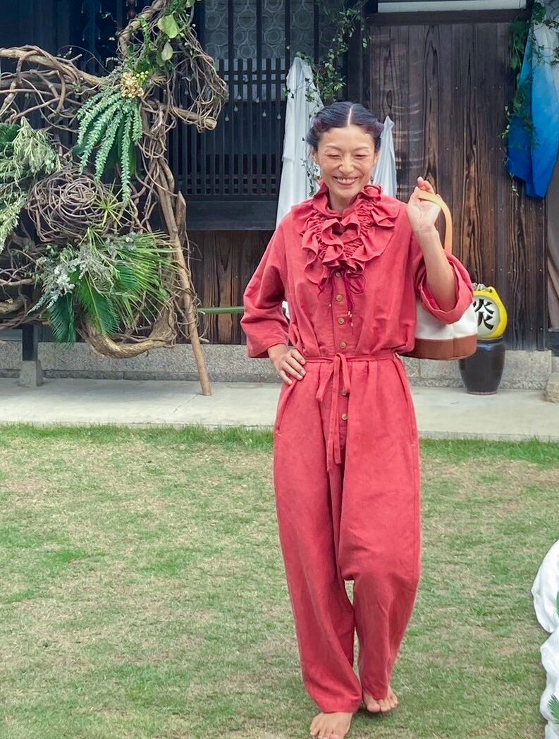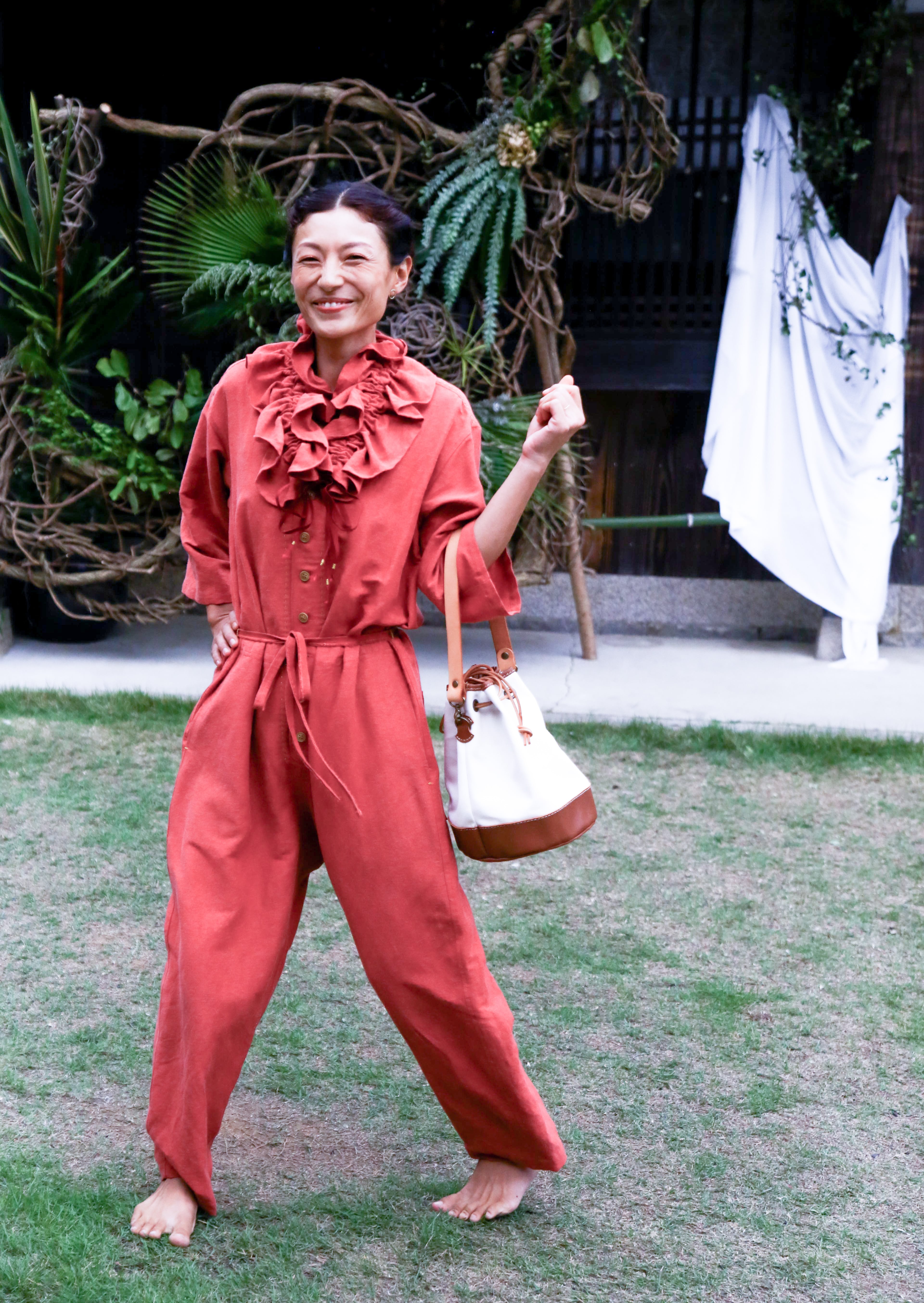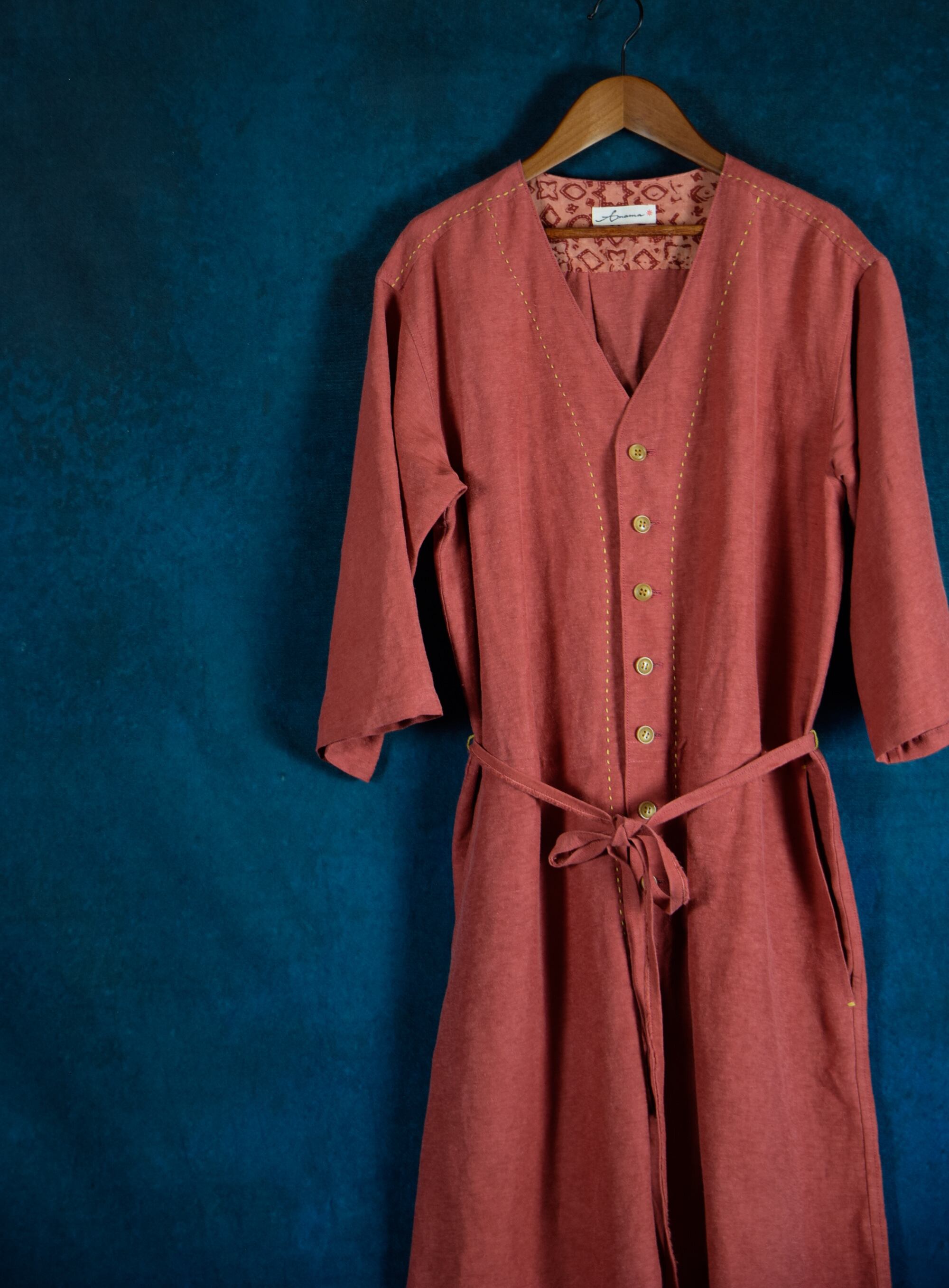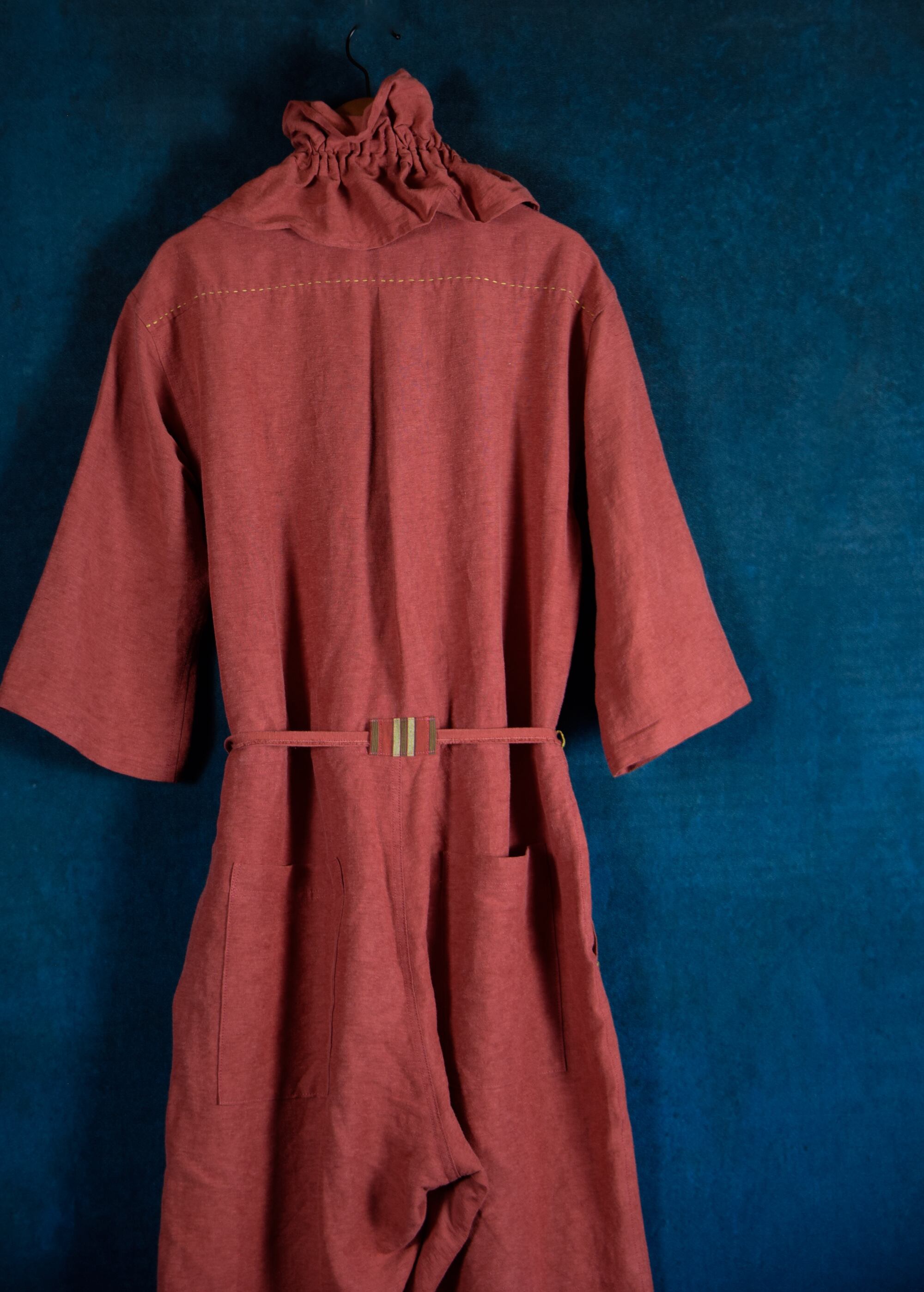 美しい茜染めを施した上質なヘンプシルク素材で仕立てた、上品でありながらカジュアルな雰囲気のつなぎです。
