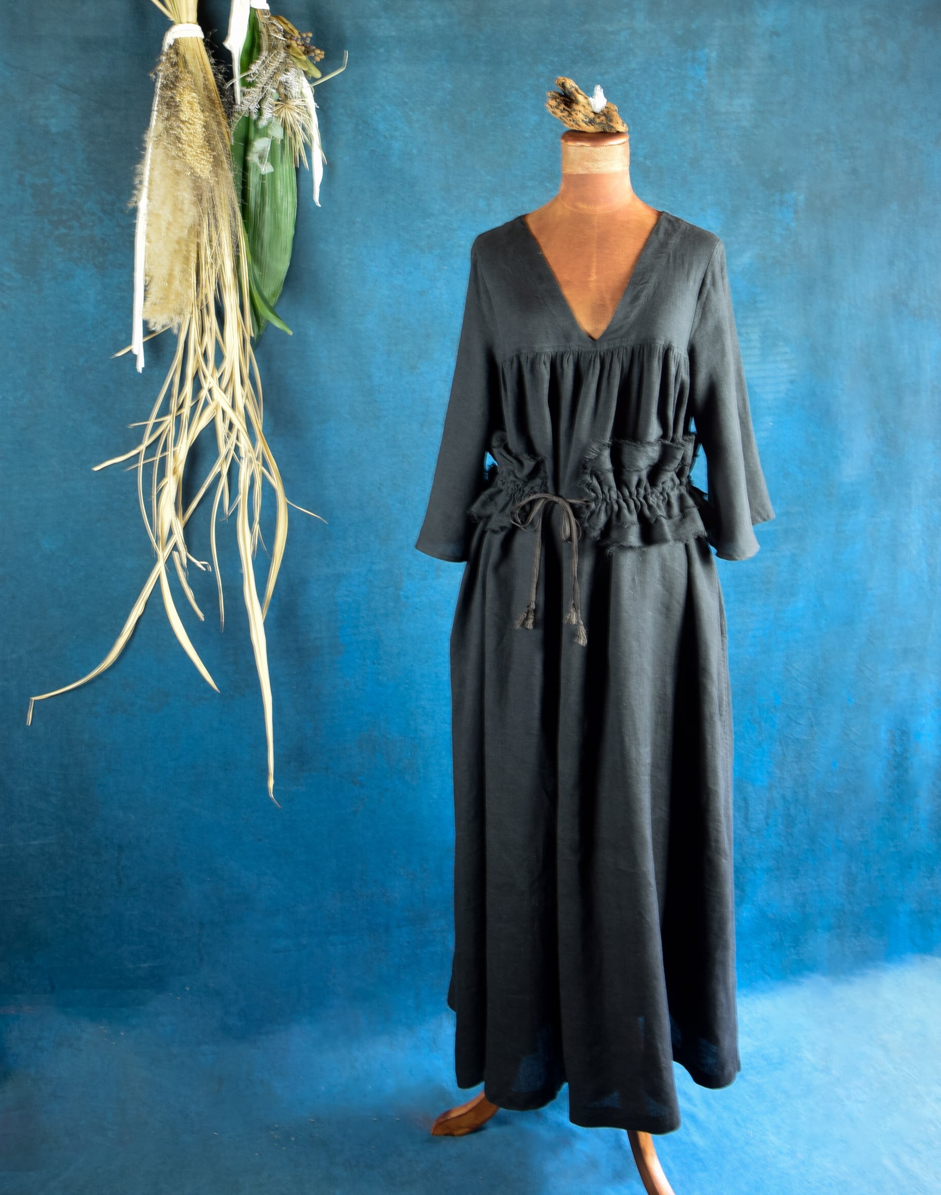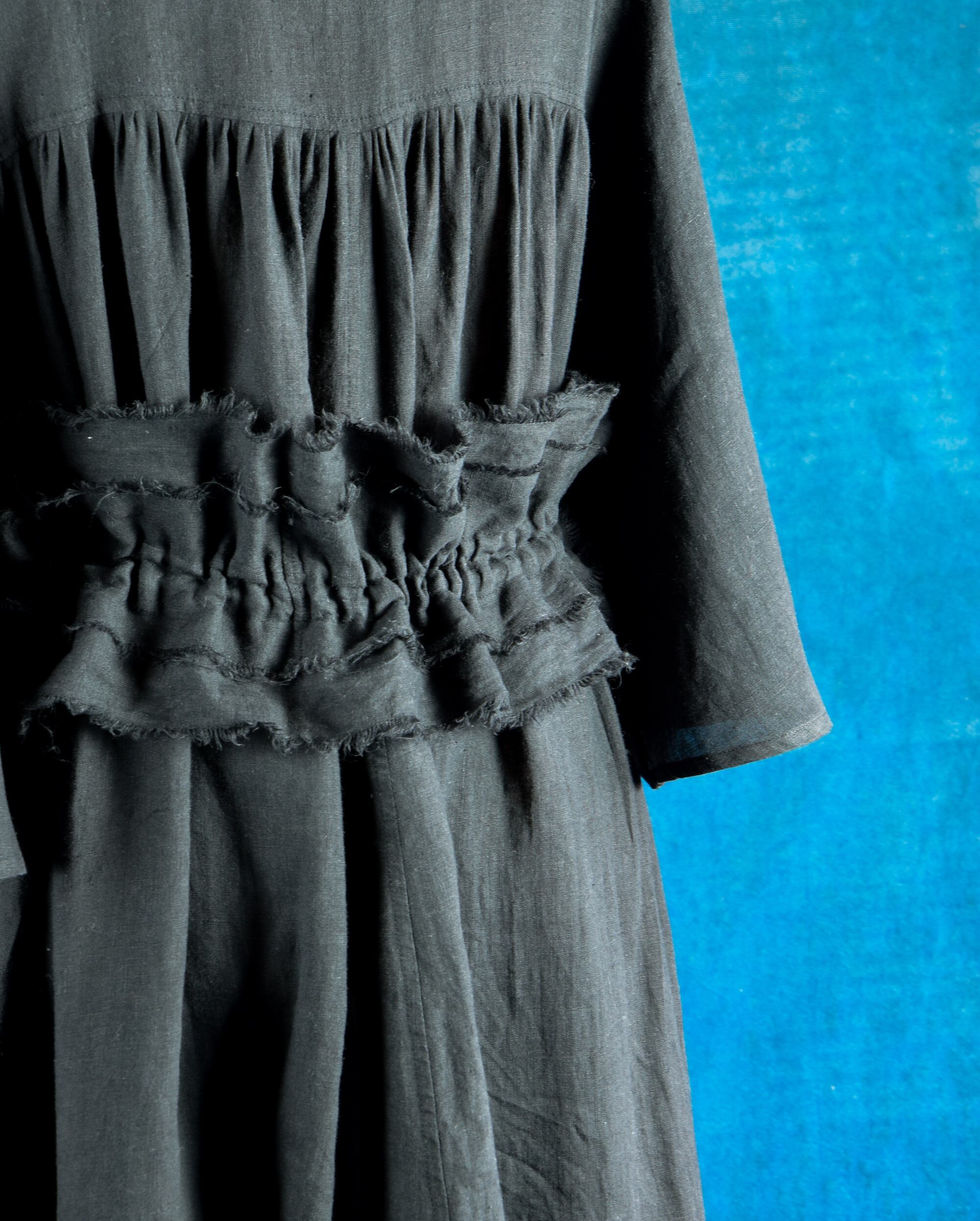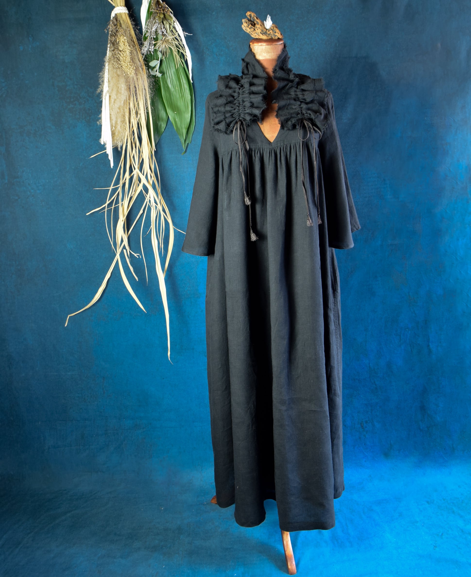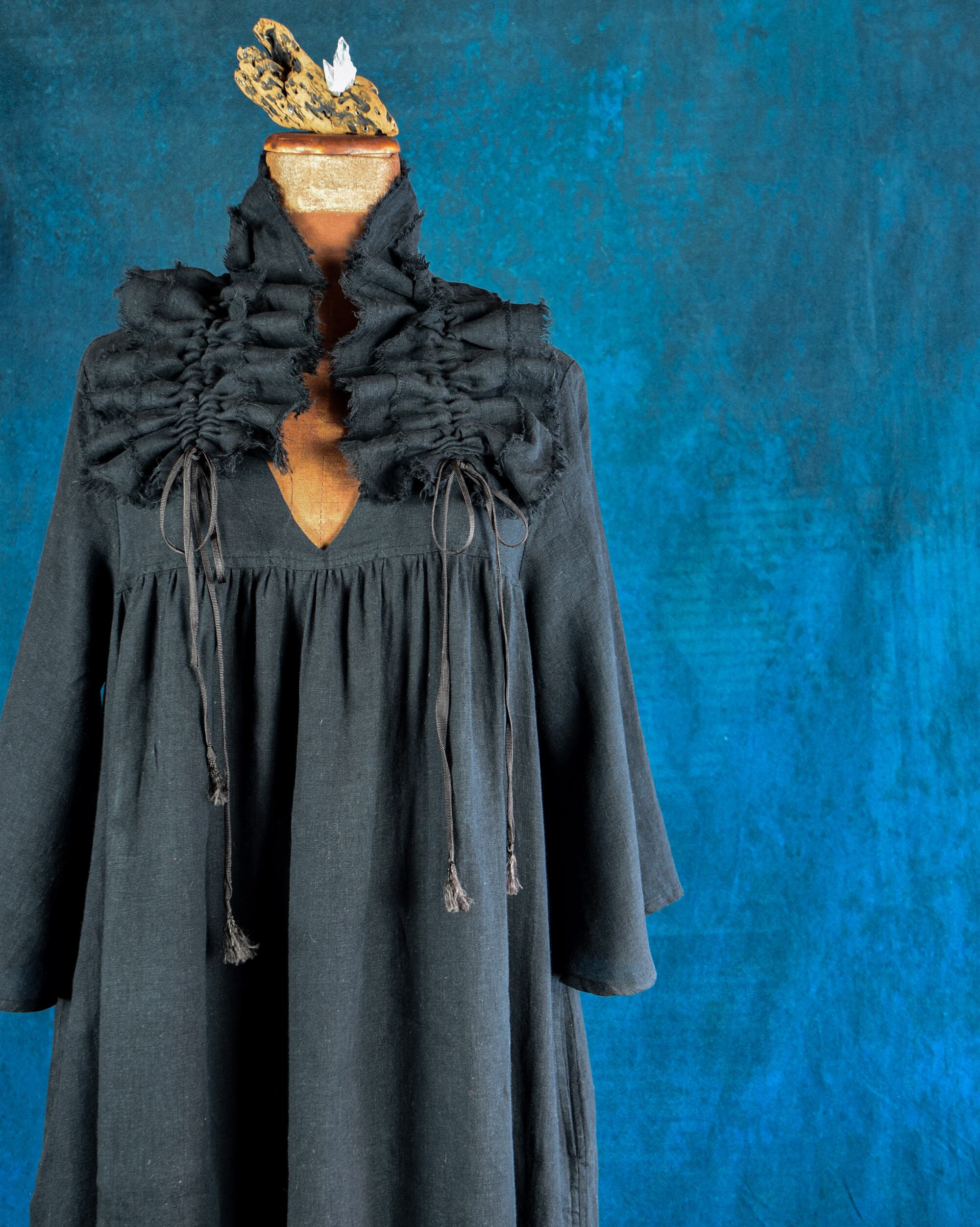 薄手の柔らかなリネン素材を使用した、エレガントなフリル襟付きのワンピースドレス。