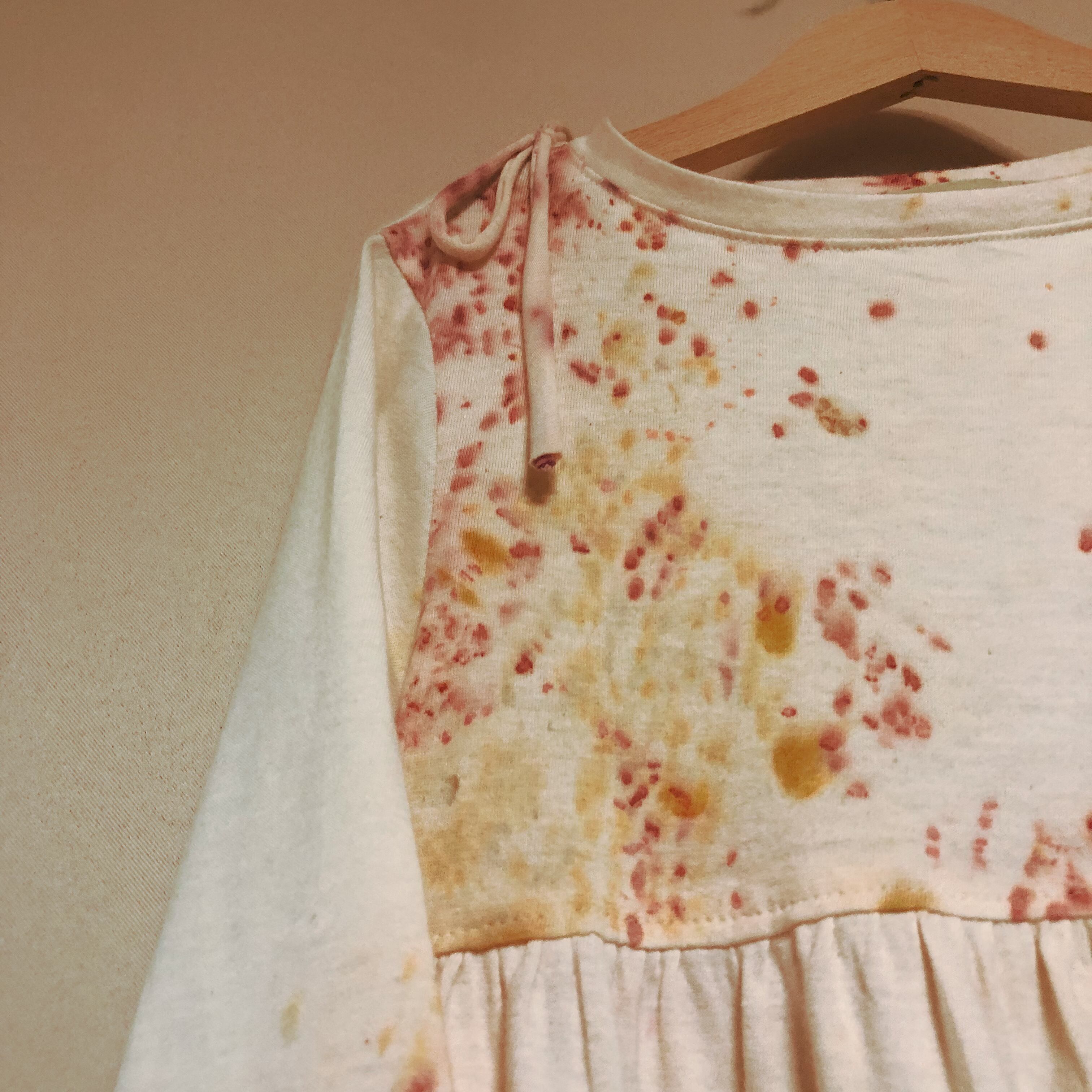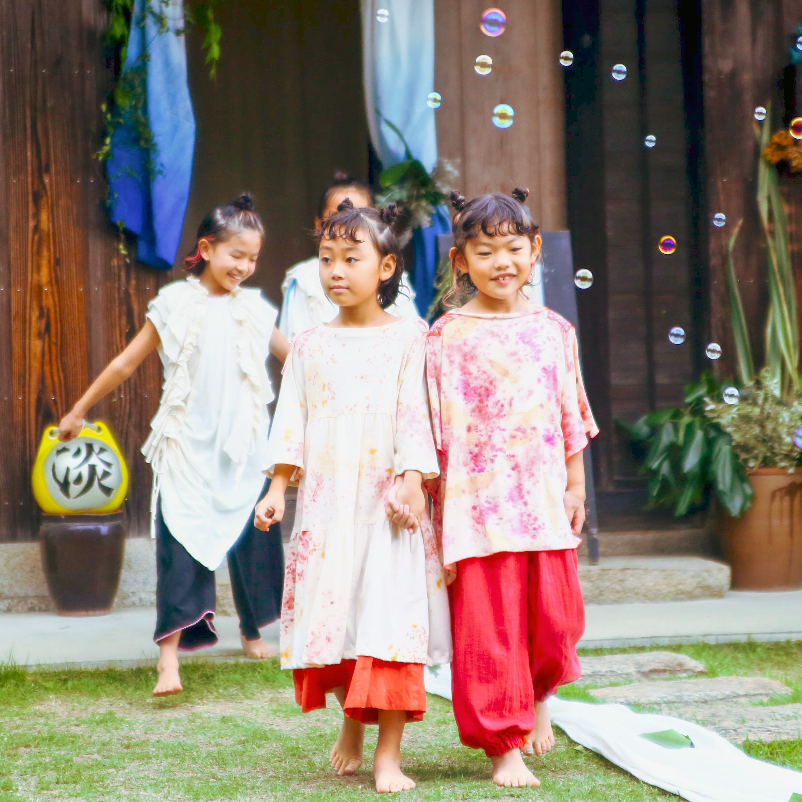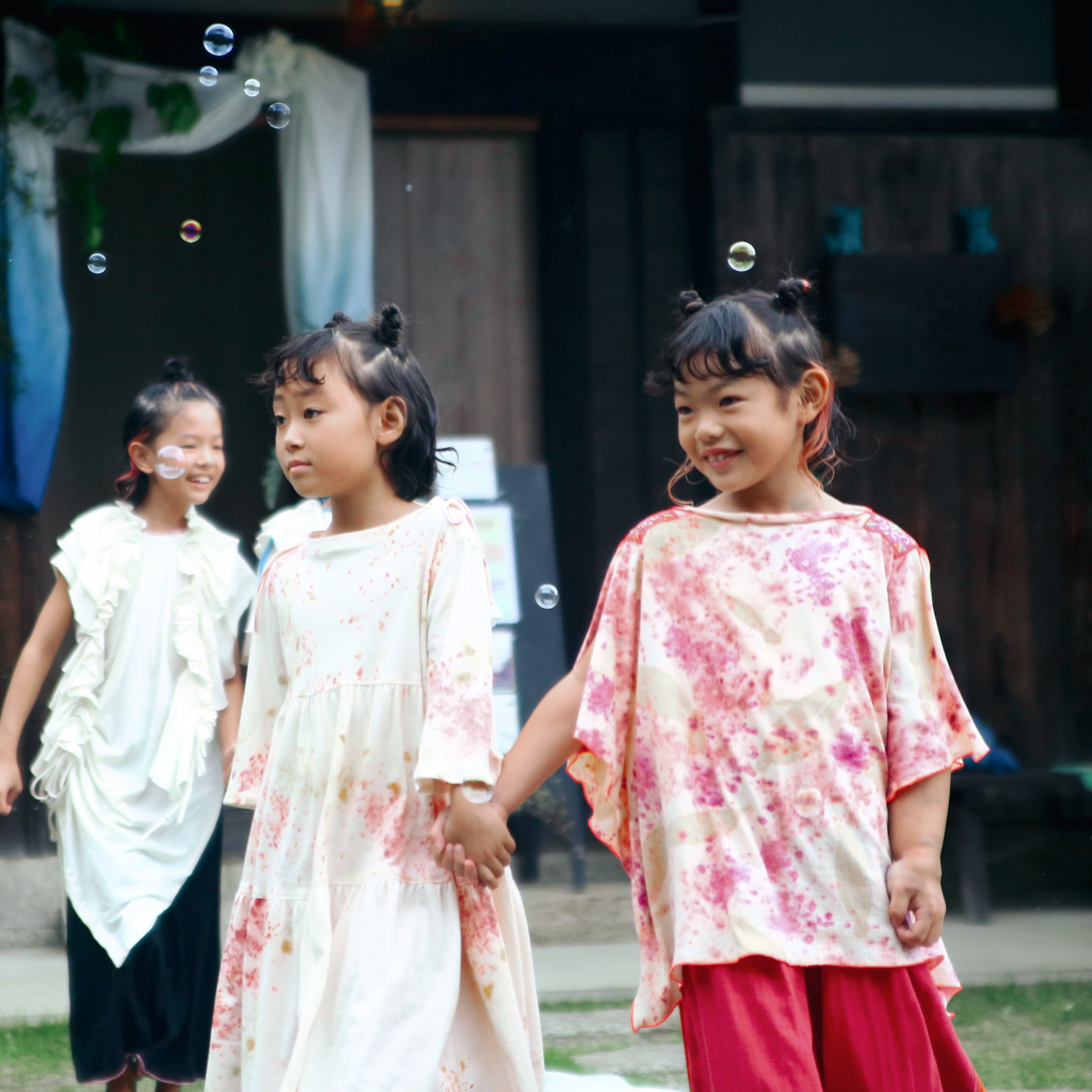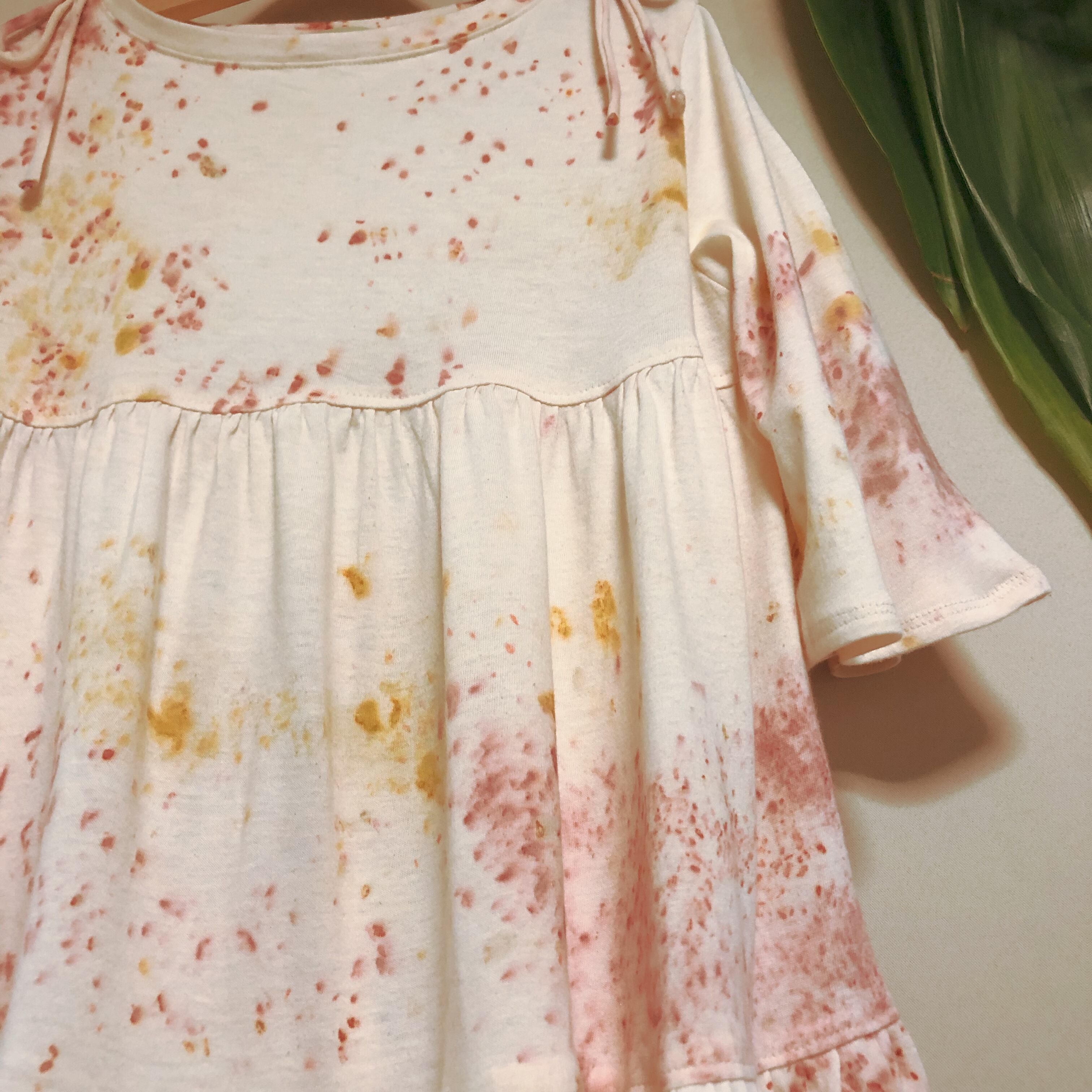 エコプリントで生まれた独自の模様は、一点一点異なるため、世界に一つだけの魅力が詰まっています。美しい自然の色味と女の子らしいデザインが、お子様の日常を愛らしく彩ってくれます。