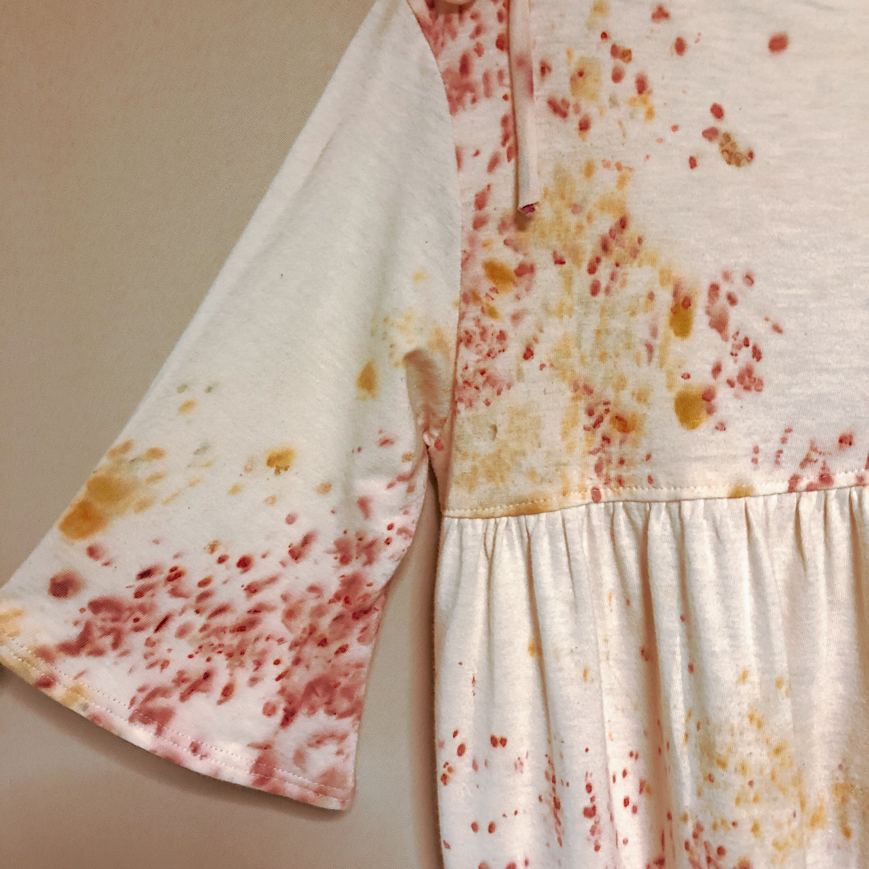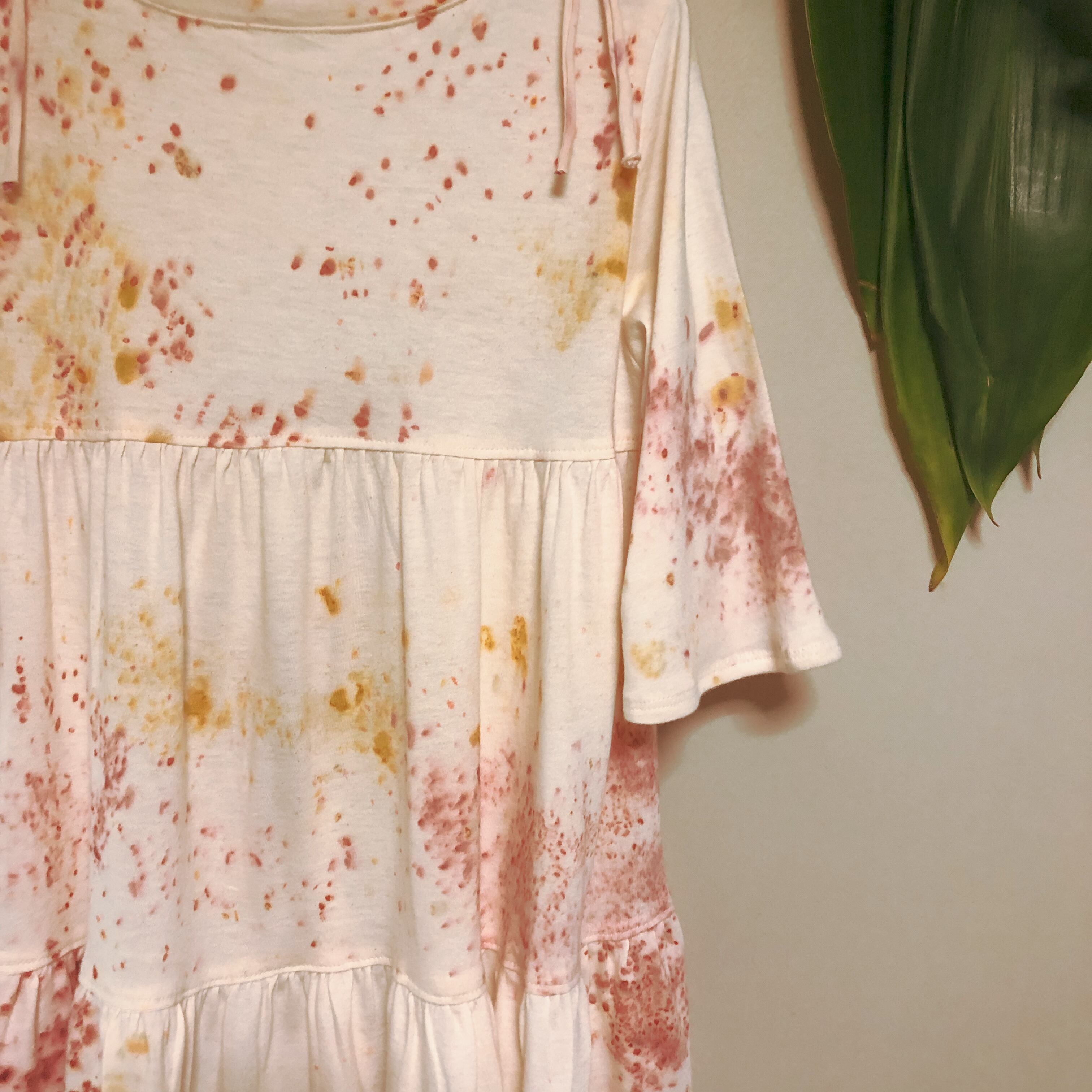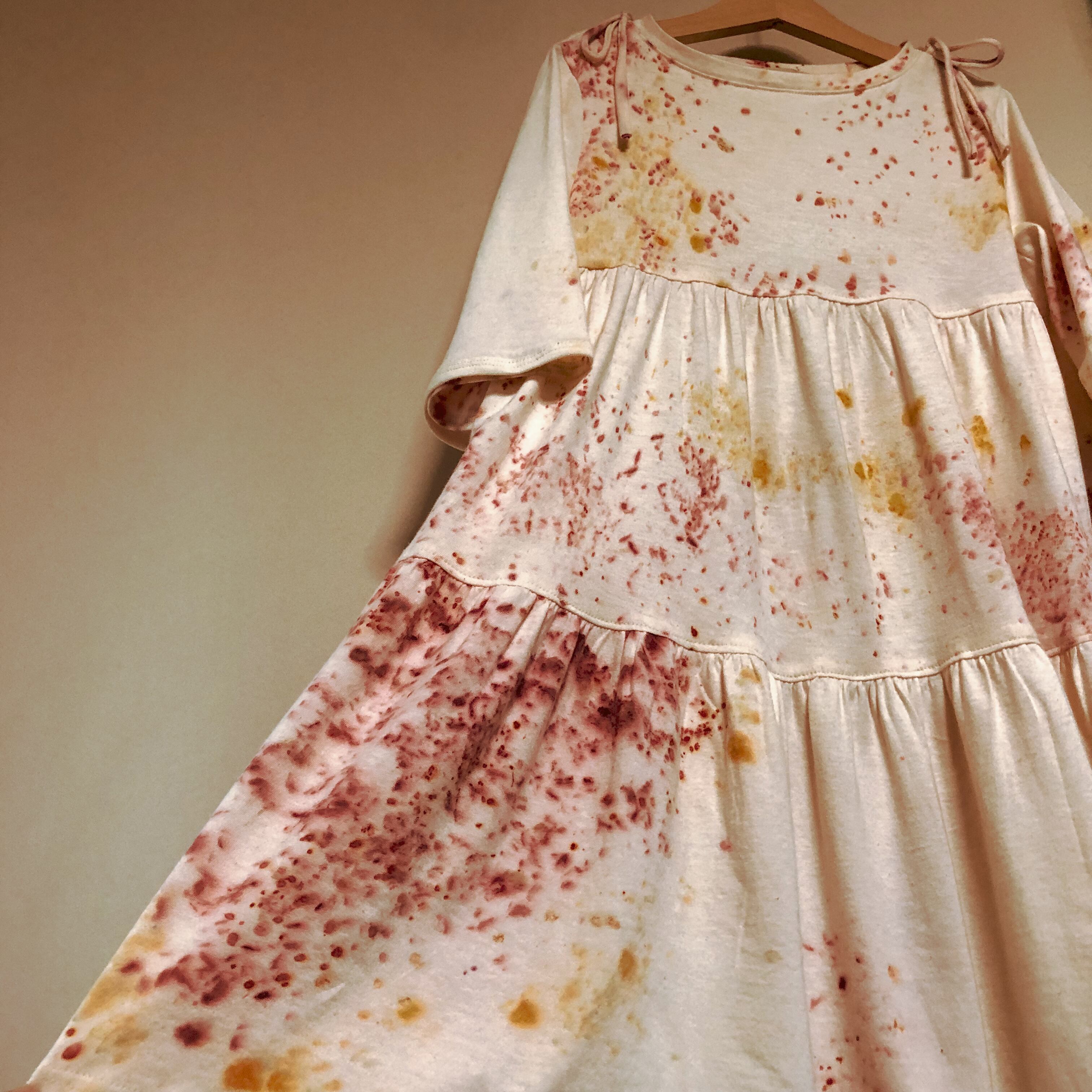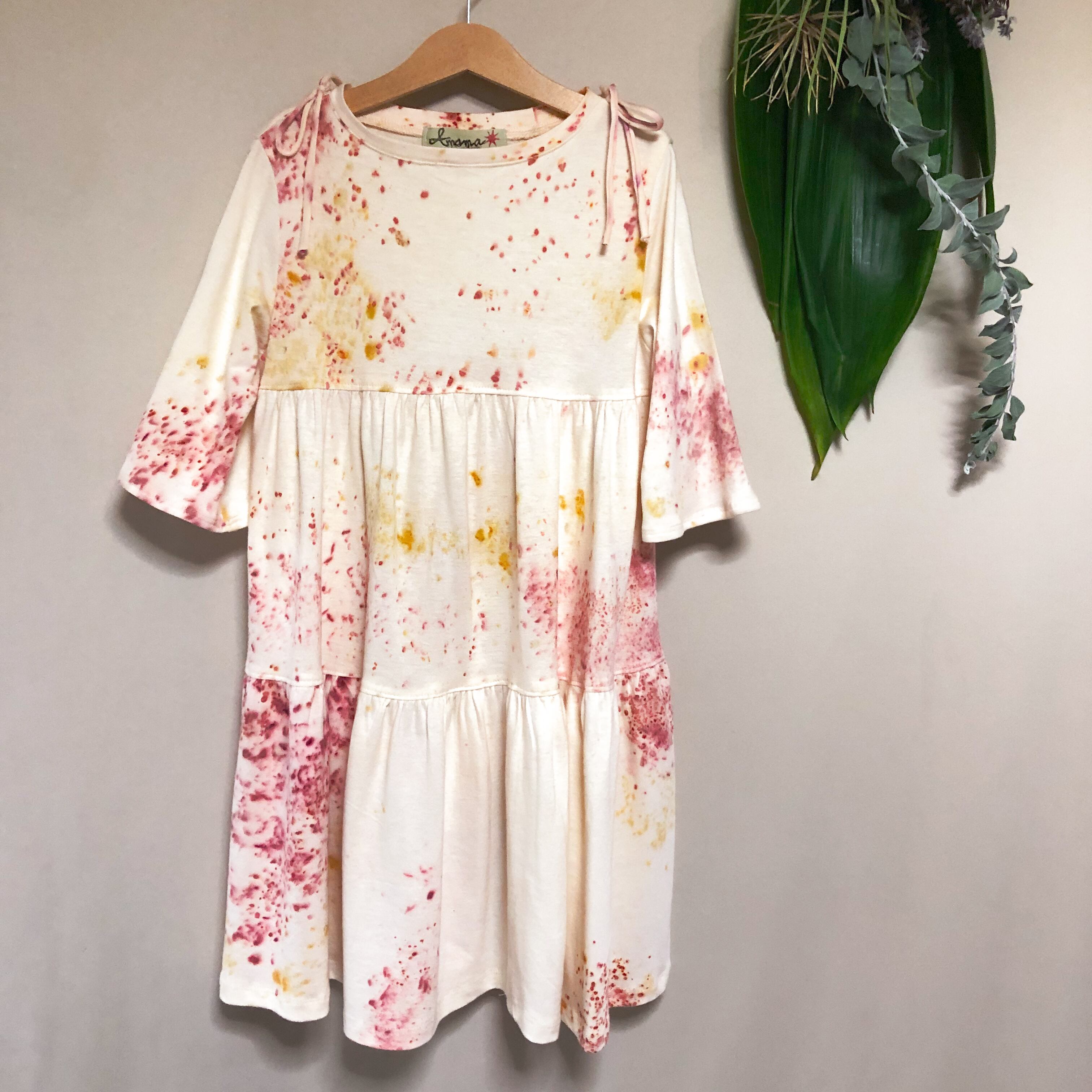 柔らかく暖かみのあるオーガニックコットンの天竺素材を使用したティアードワンピースは、エコプリント技法で染色された自然の模様が施されています。