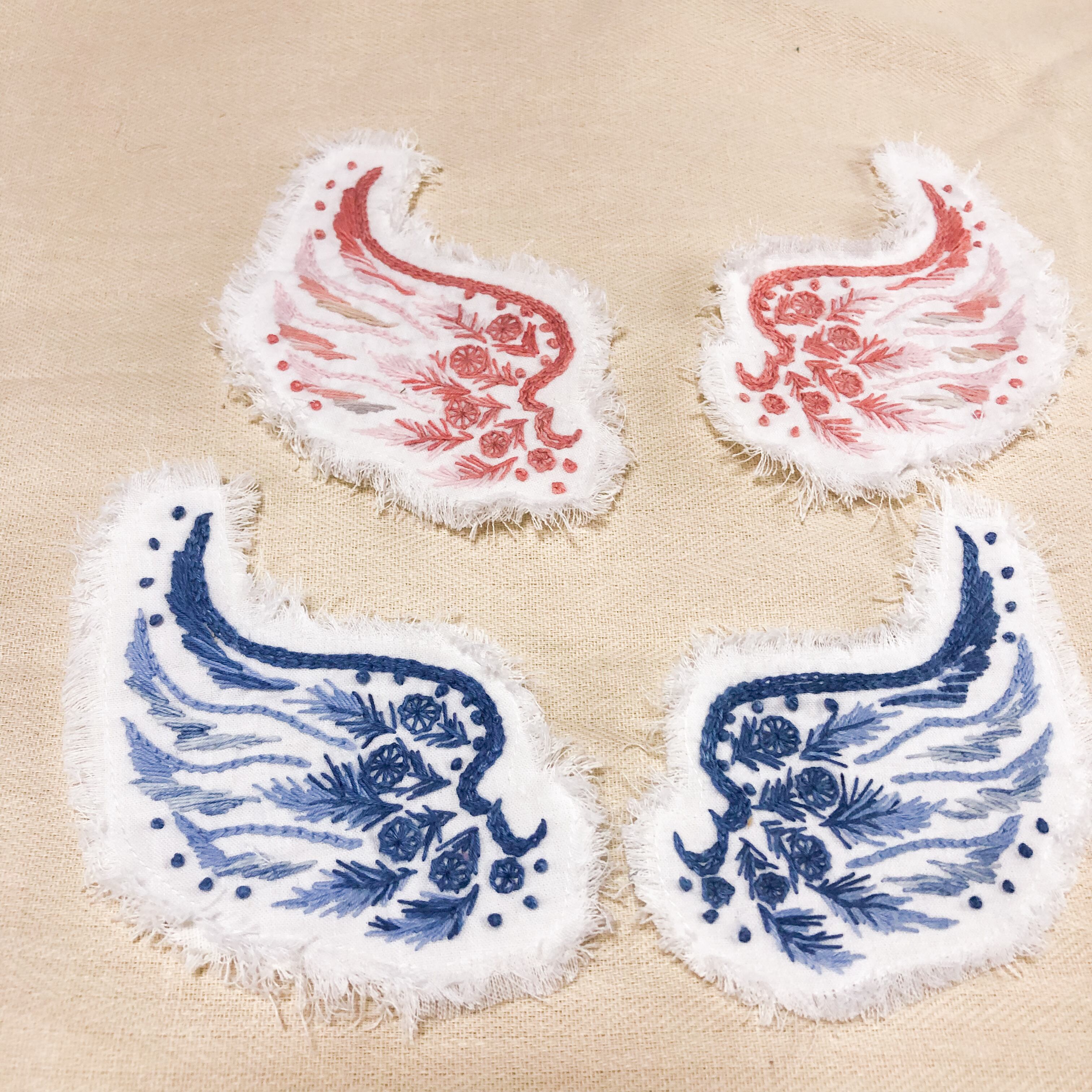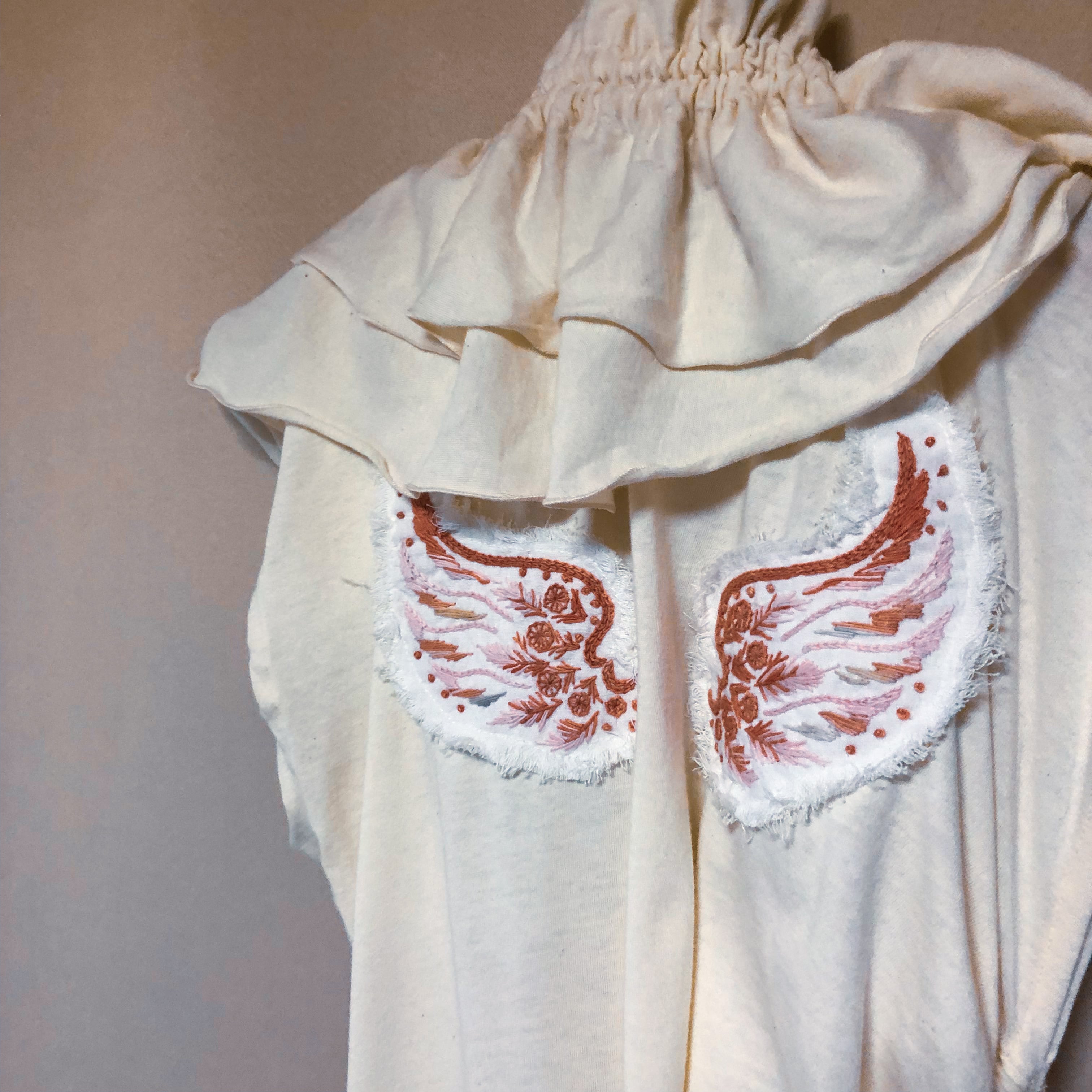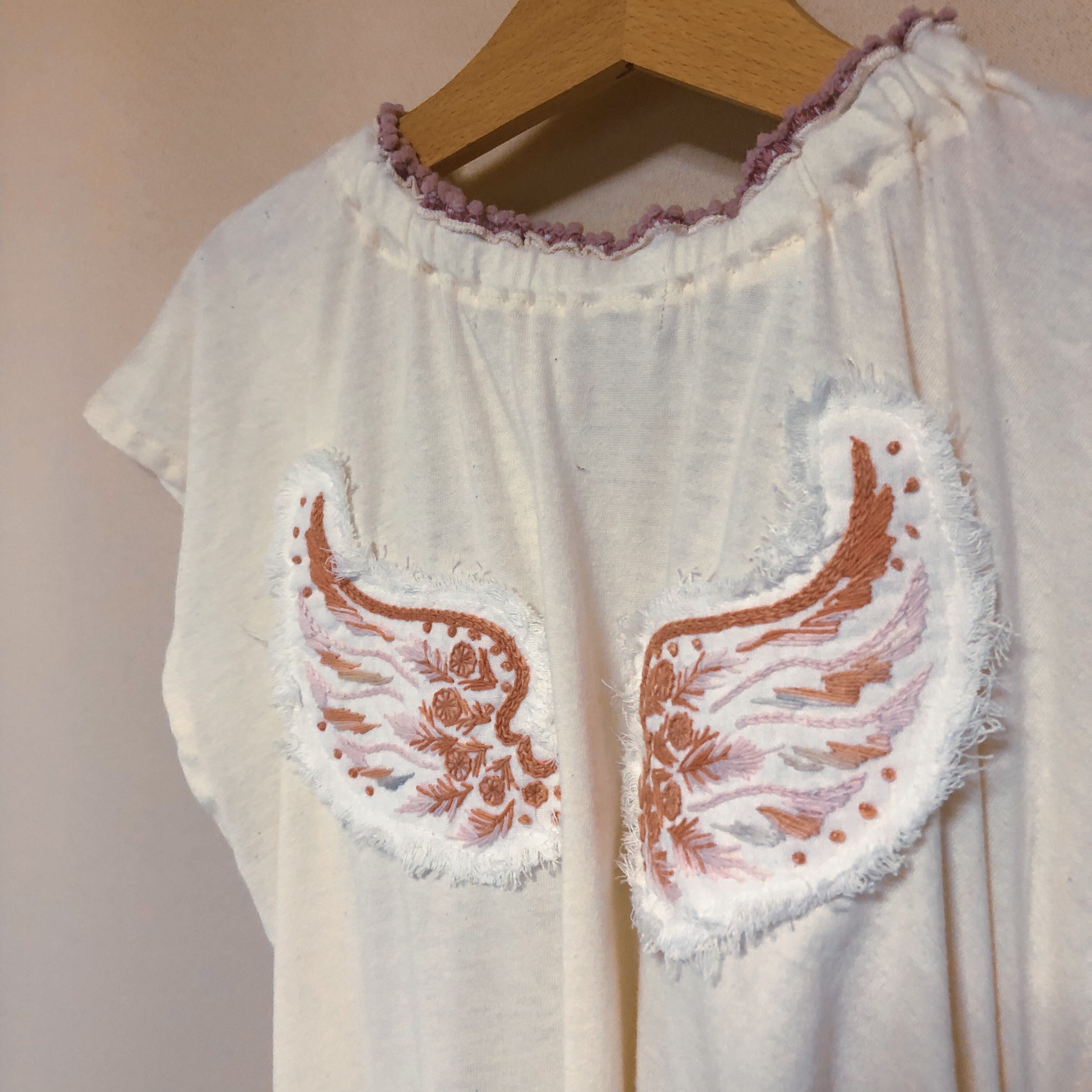 背中には茜染めの糸でanicca workさんに刺繍を施してもらった、天使の翼のワッペンが手縫いされています。