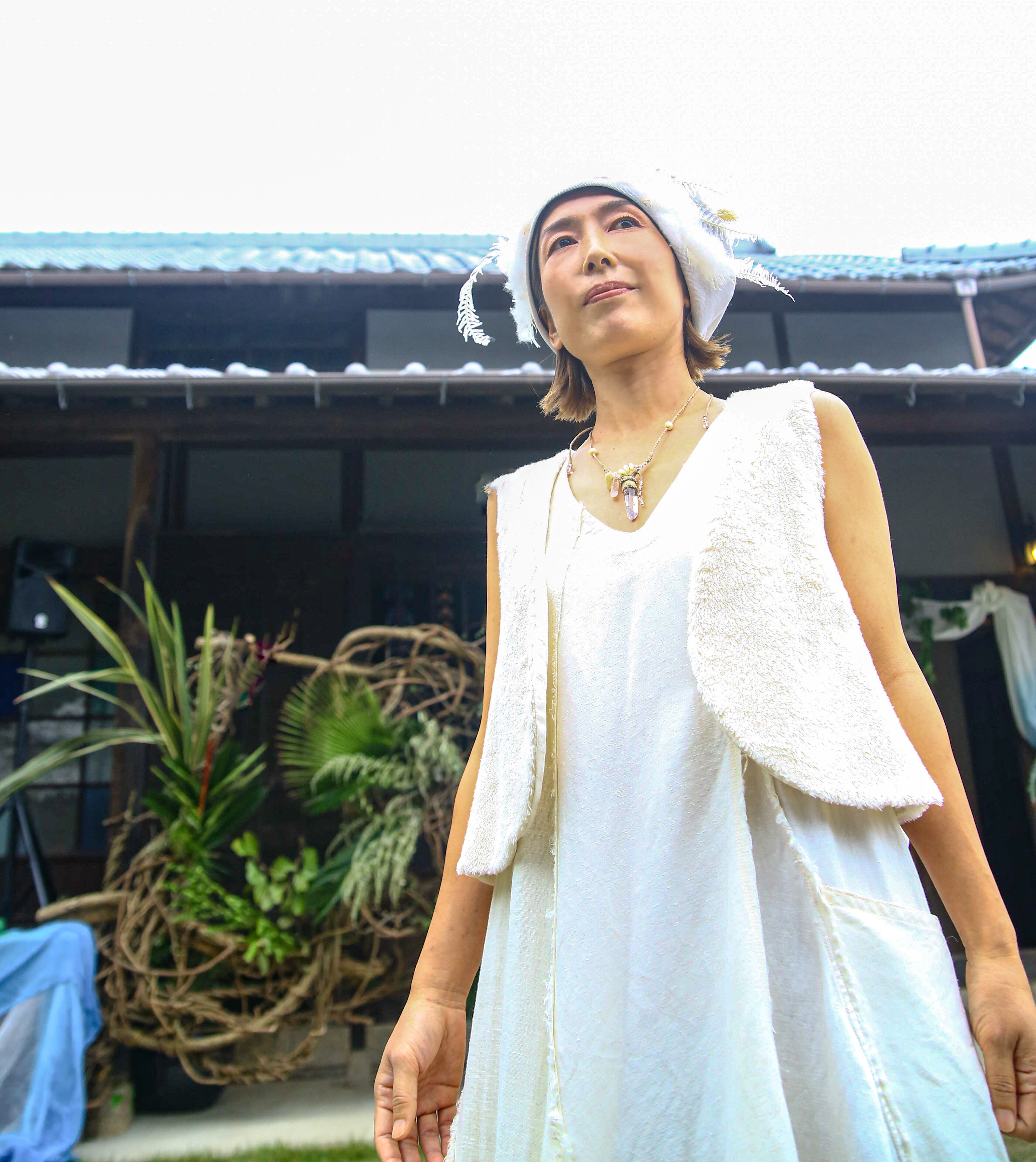 背面には光沢のあるヘンプシルク、ヘンプ100%などの数種類の生地を使って、美しいパッチワークと刺繍を施した個性的なデザインが特徴です。