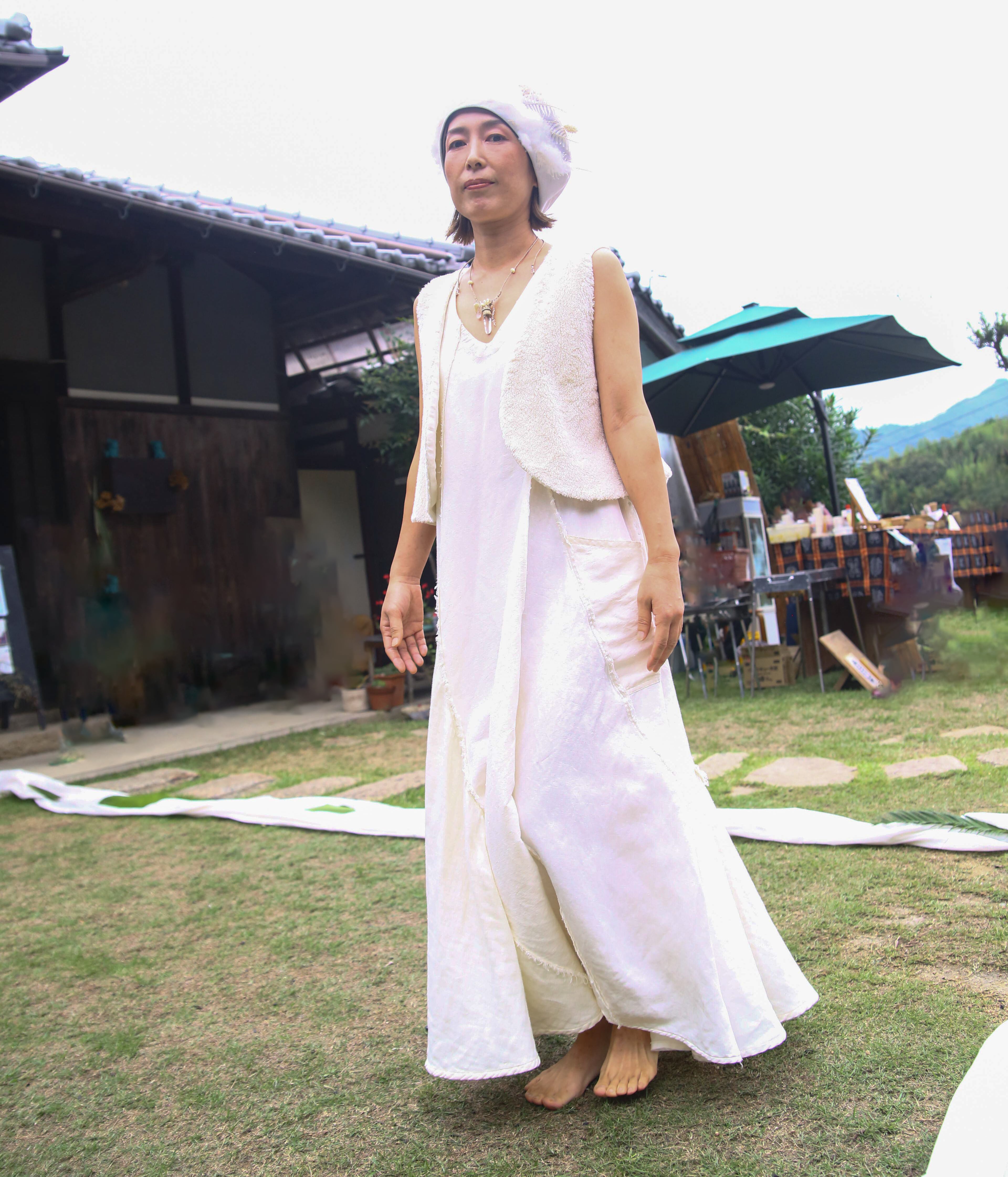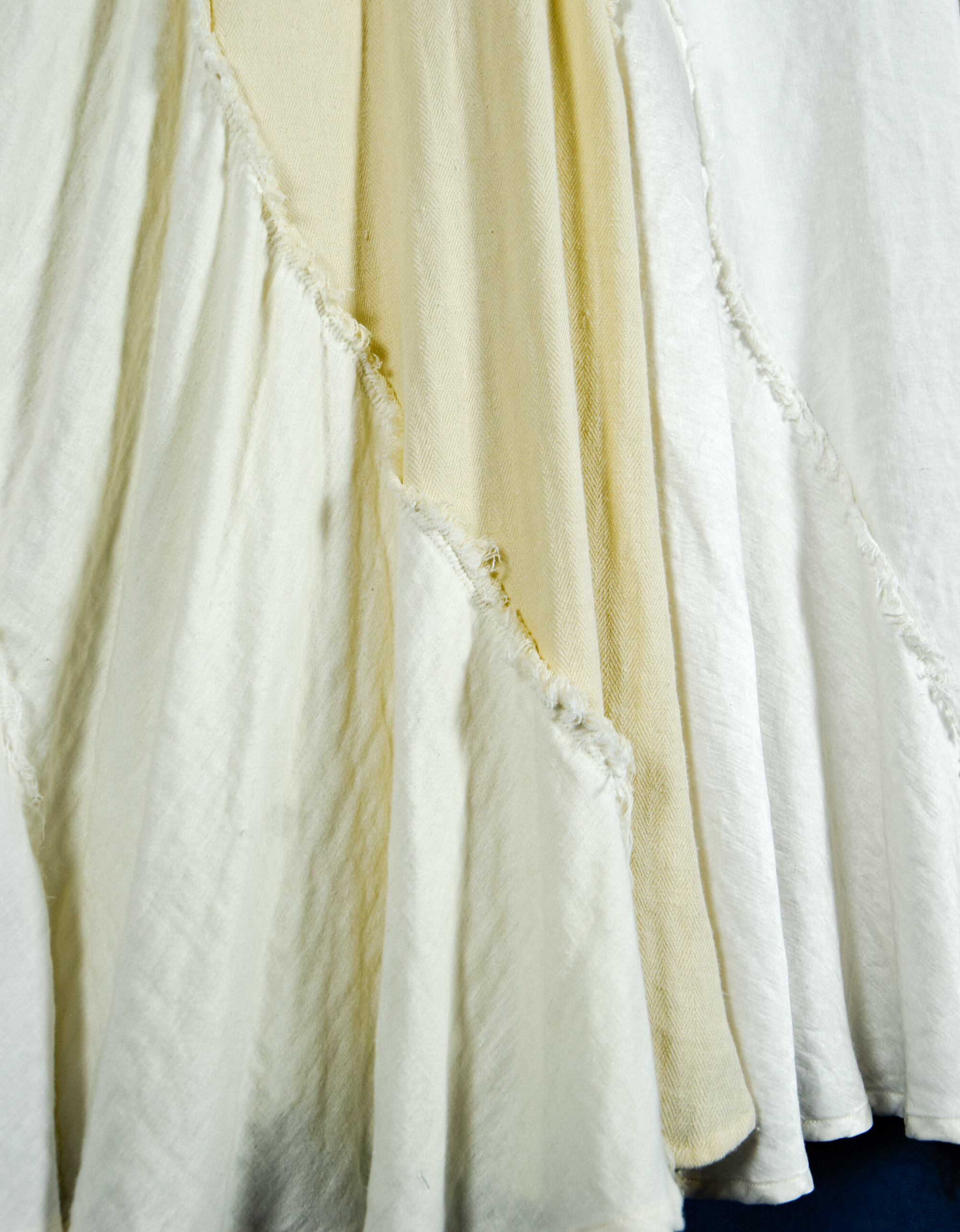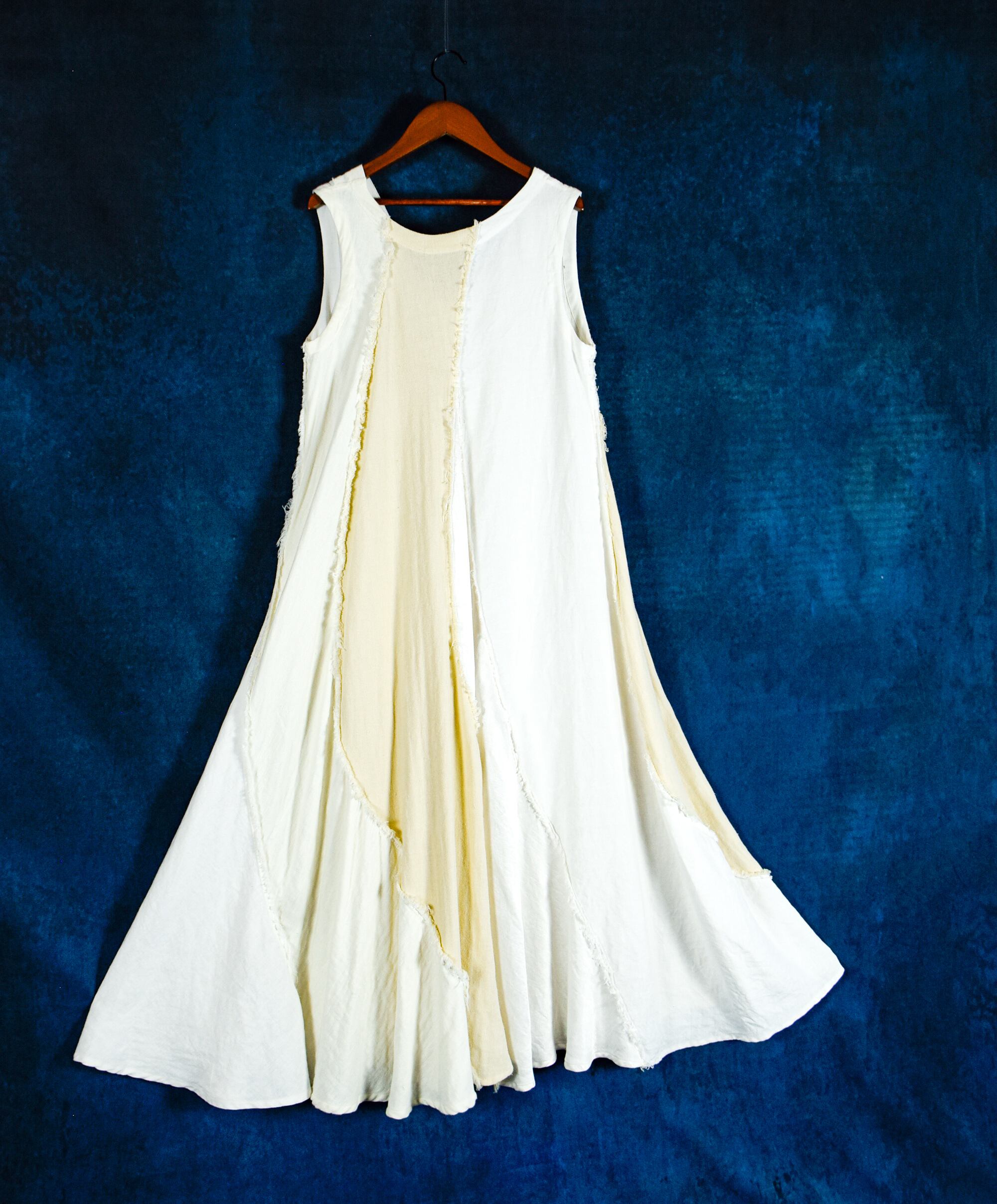 多様な素材を贅沢に使用したこのドレスは、ヘンプシルク、ヘンプシルクサテン、ヘンプコットン、ヘンプ100%など、5種類の異なる生地を巧みに組み合わせ、9枚接ぎでたっぷりのフレアーラインのドレスに仕立てました。