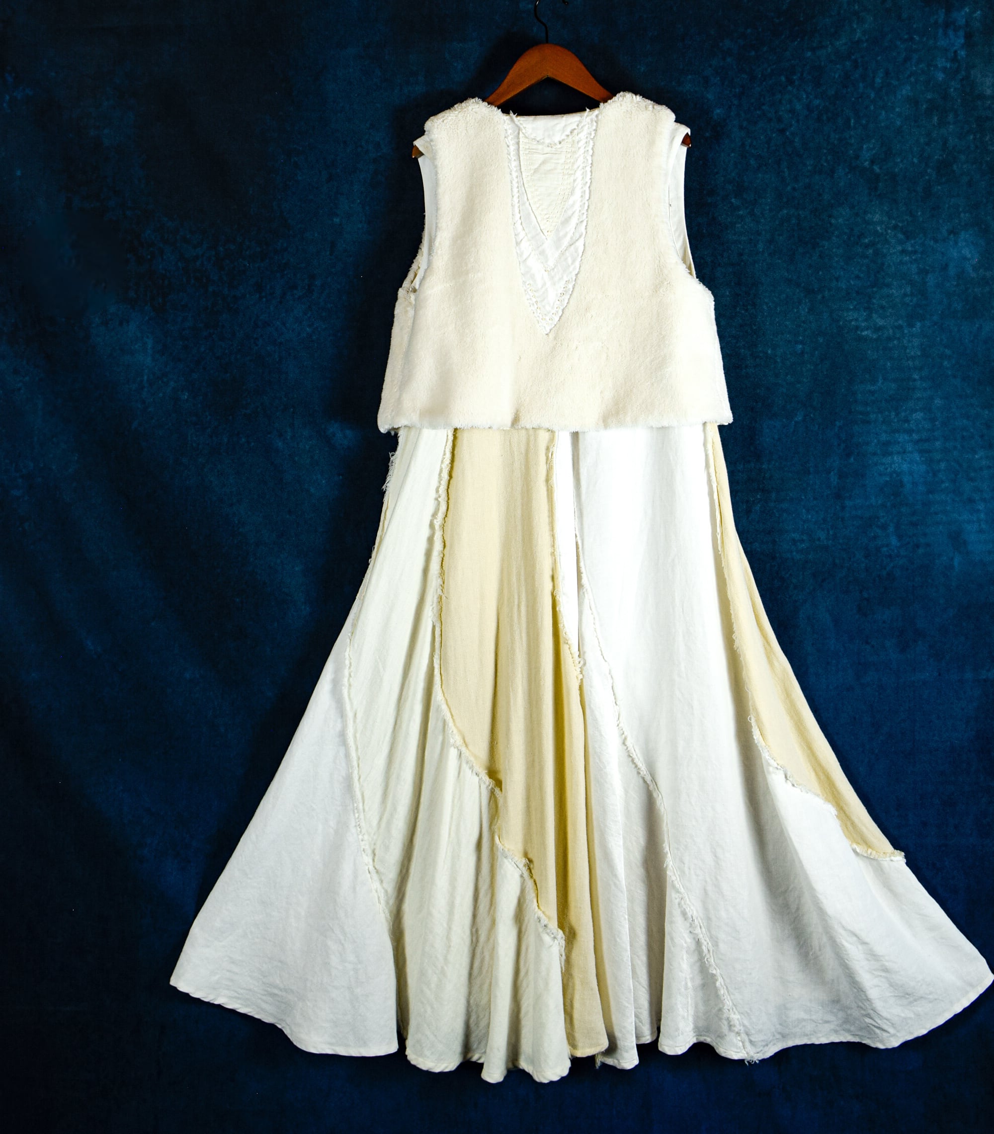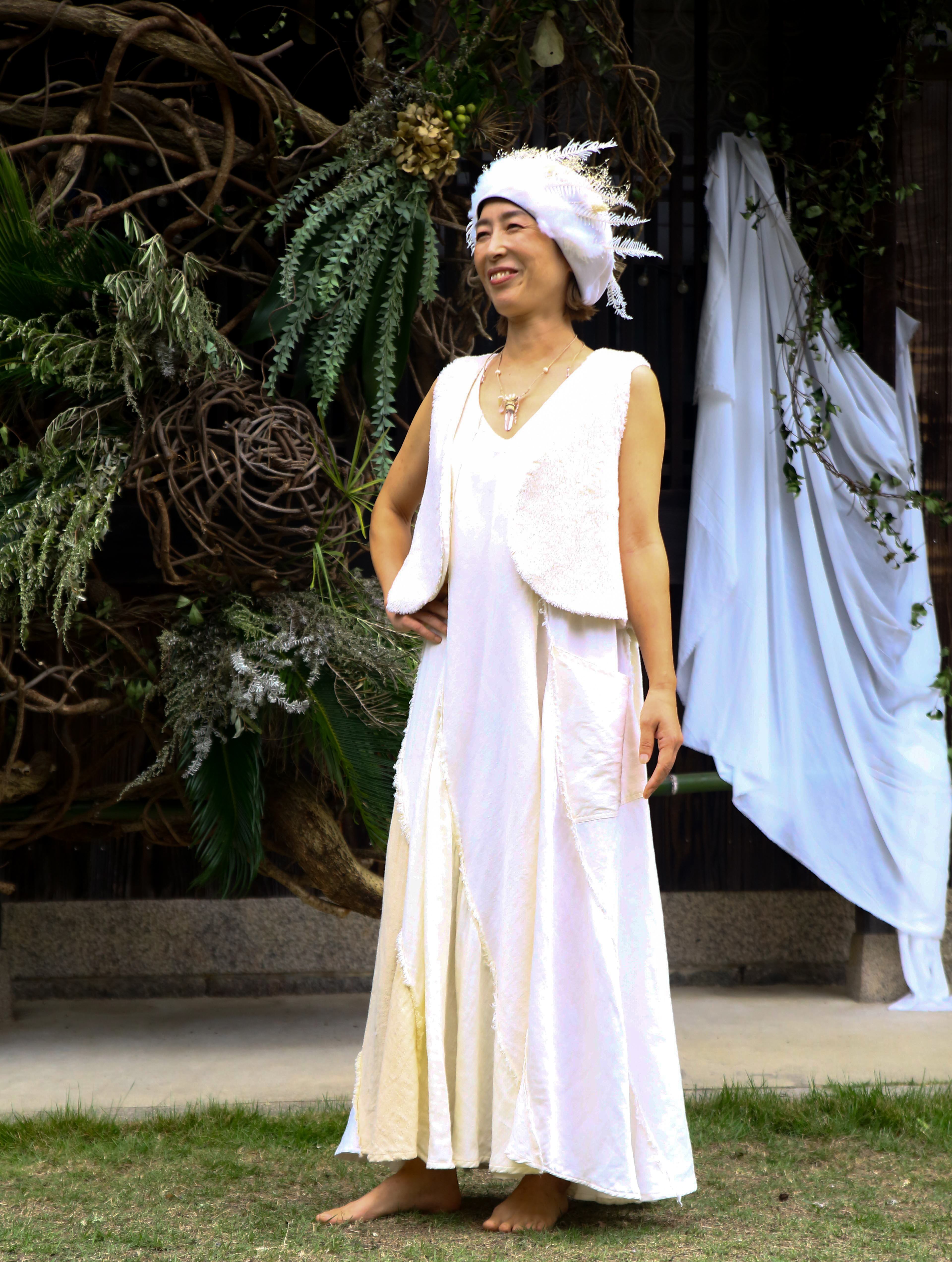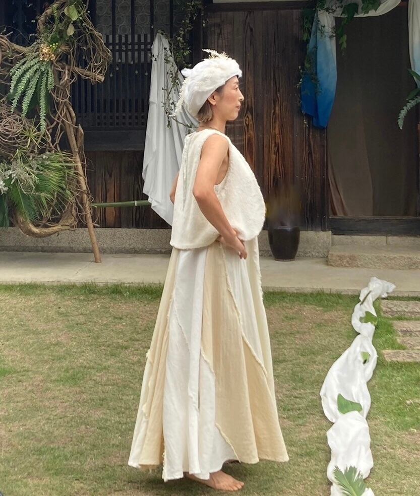 多様な素材を贅沢に使用したこのドレスは、ヘンプシルク、ヘンプシルクサテン、ヘンプコットン、ヘンプ100%など、5種類の異なる生地を巧みに組み合わせ、9枚接ぎでたっぷりのフレアーラインのドレスに仕立てました。