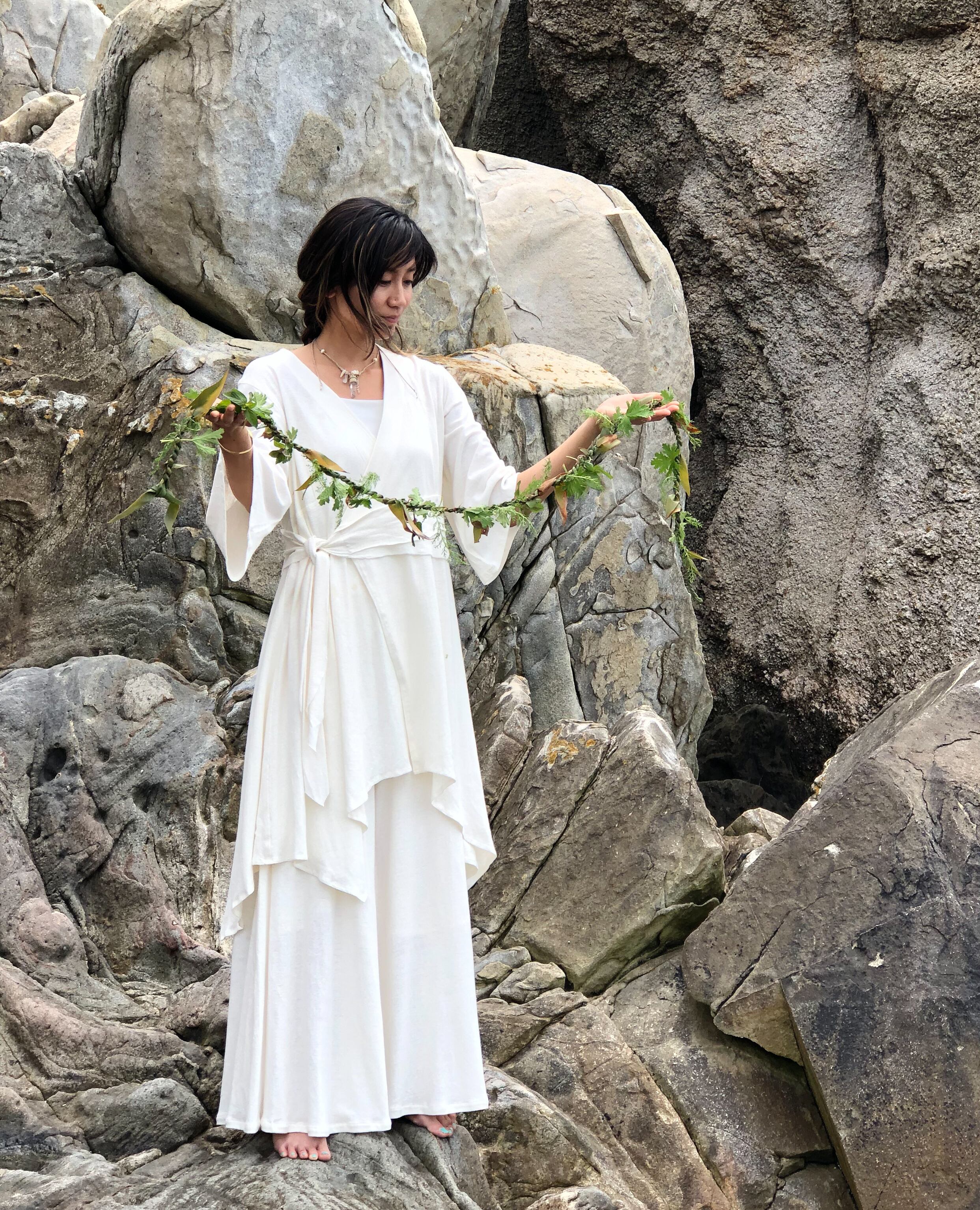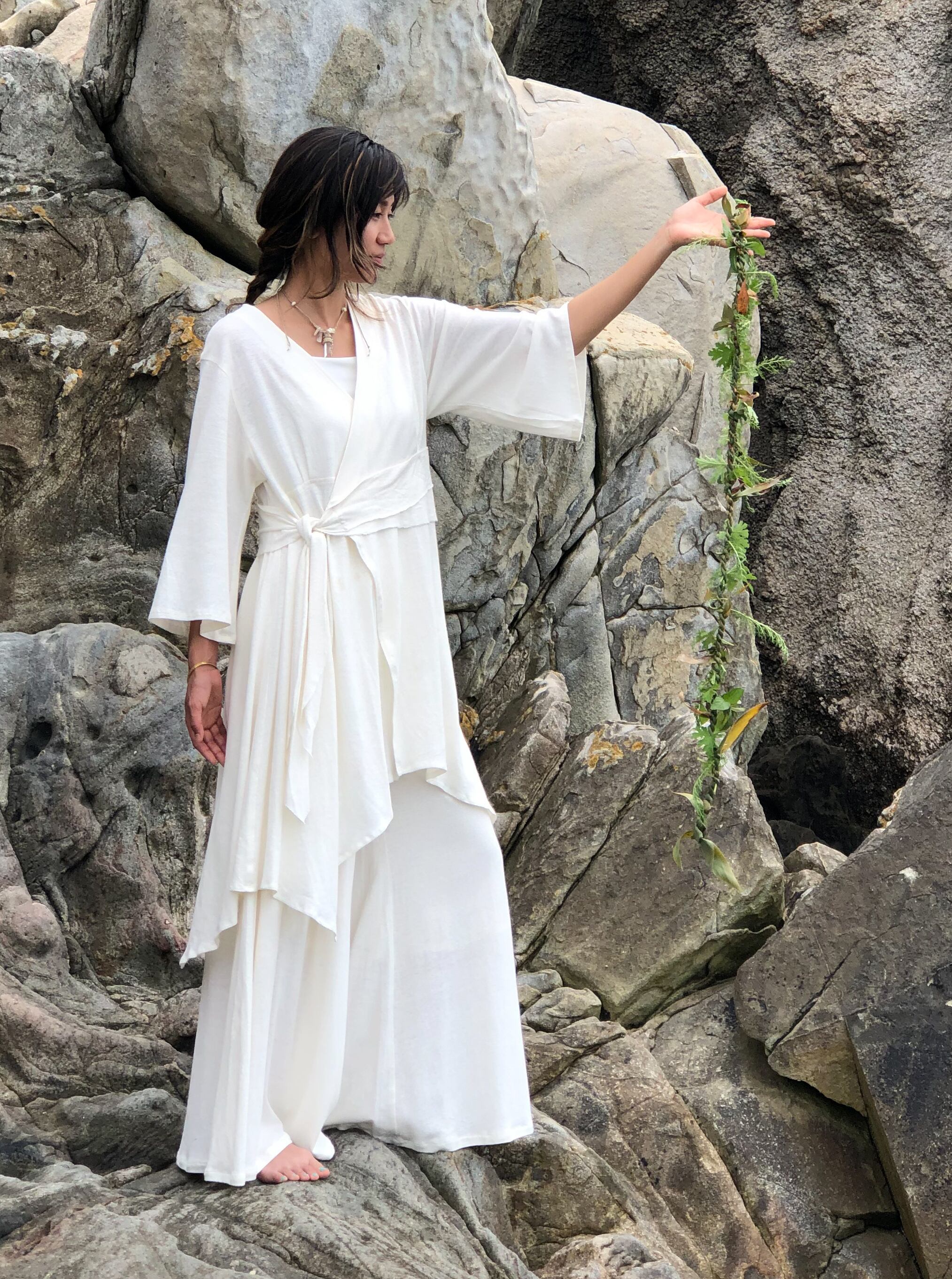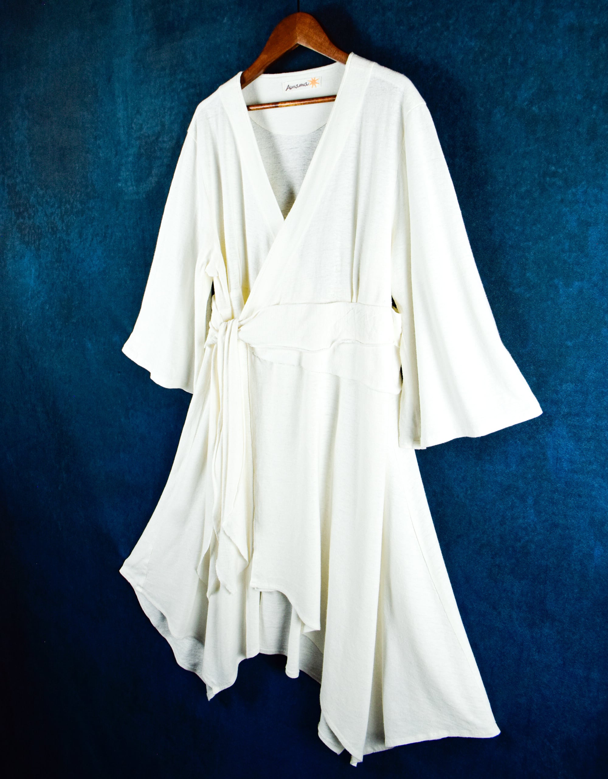 ヘンプ、オーガニックコットンの軽やかな天竺素材で仕立てたカシュクール羽織りは、エレガントで女性らしいシルエットを引き立てます。