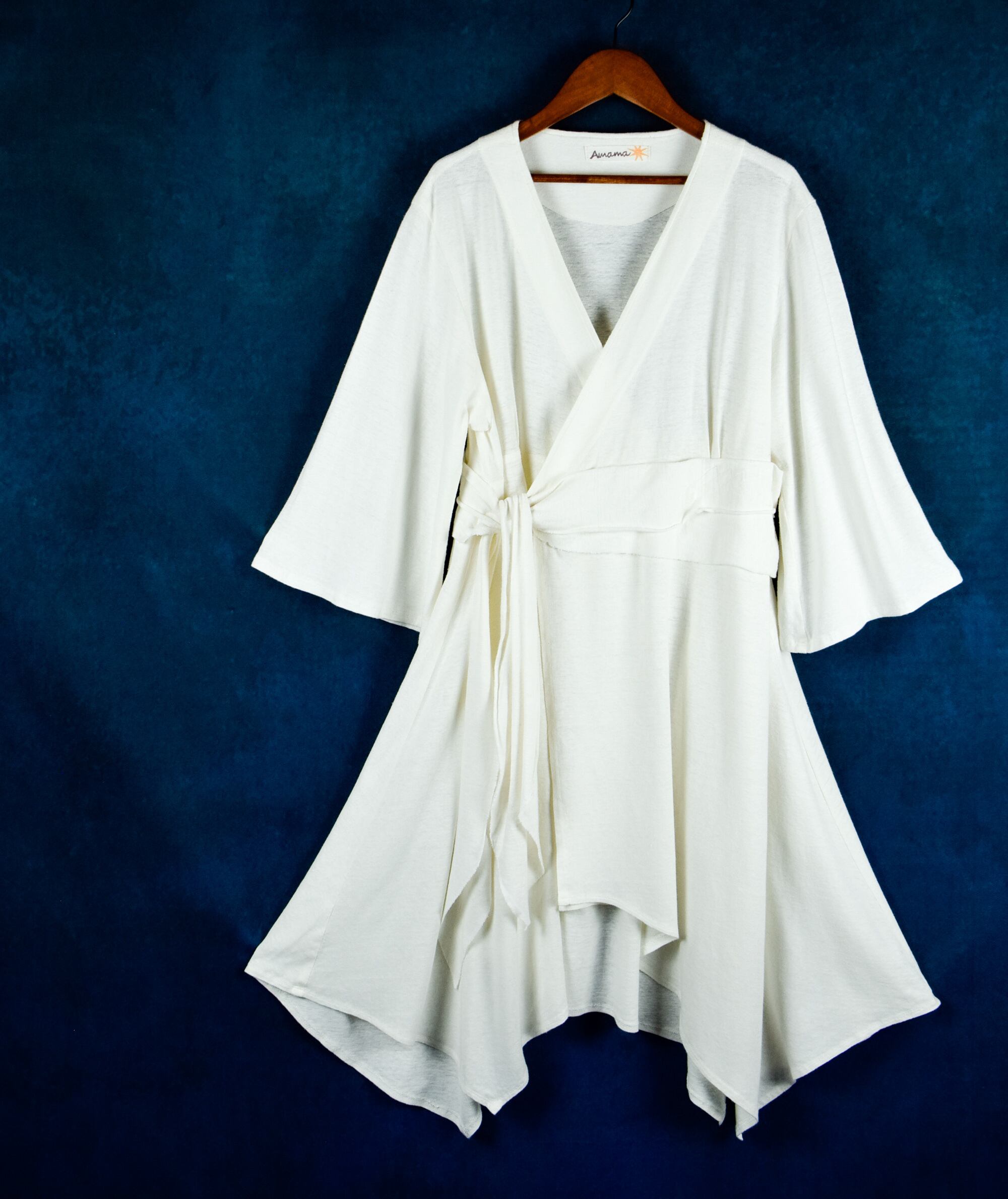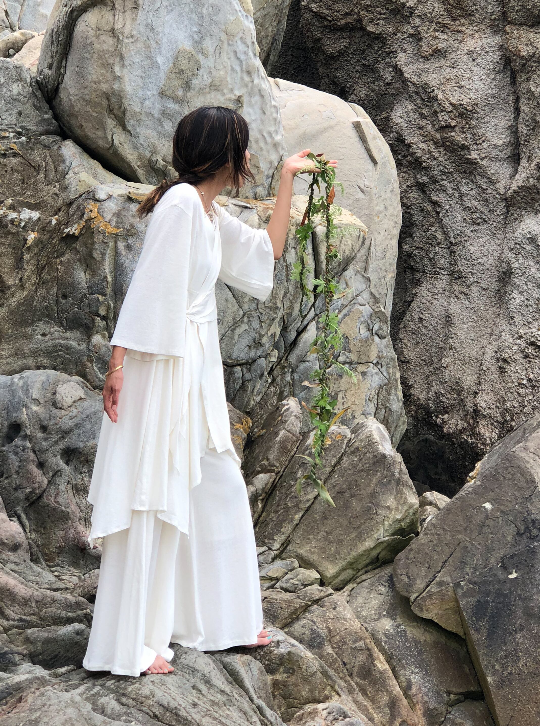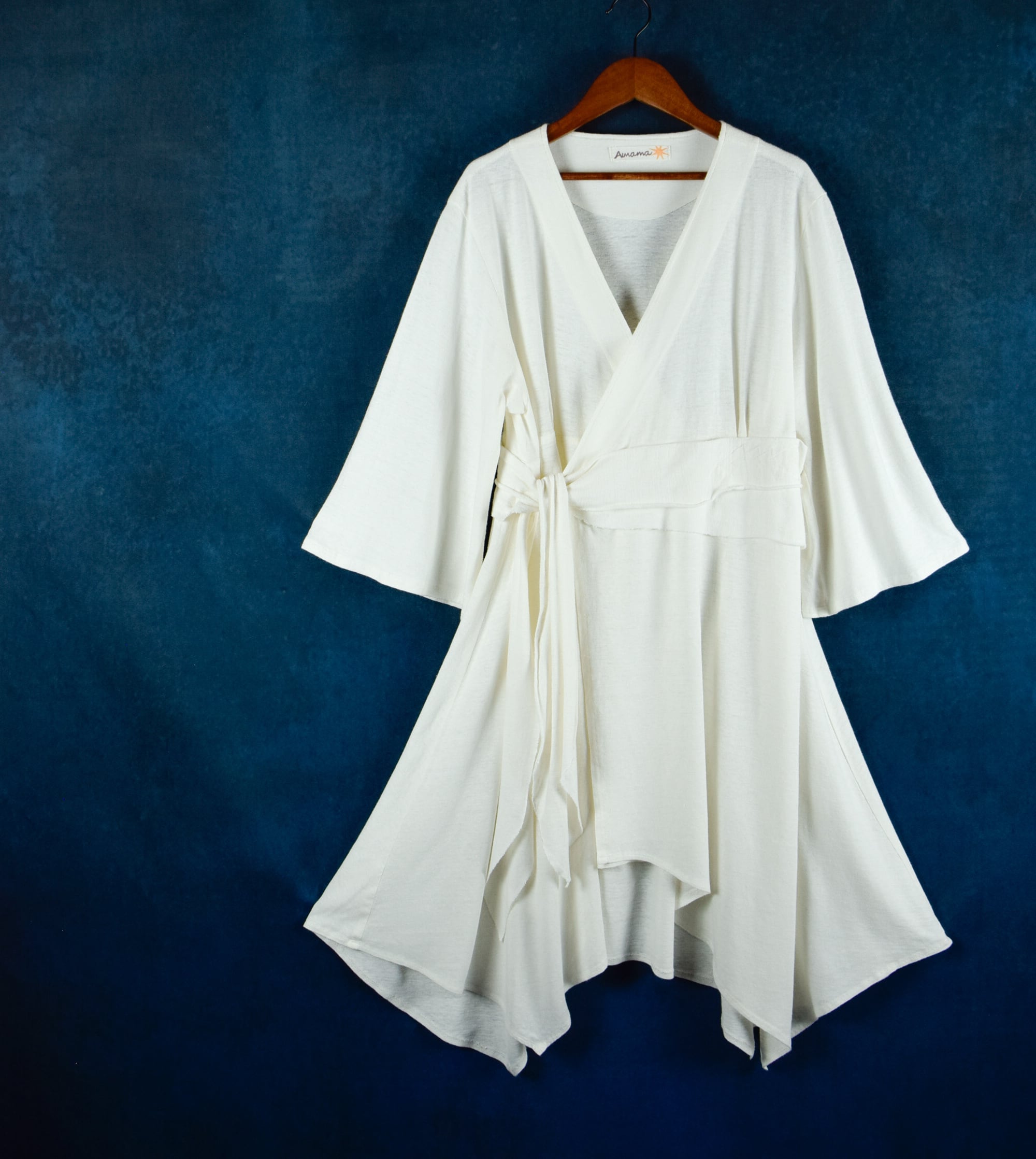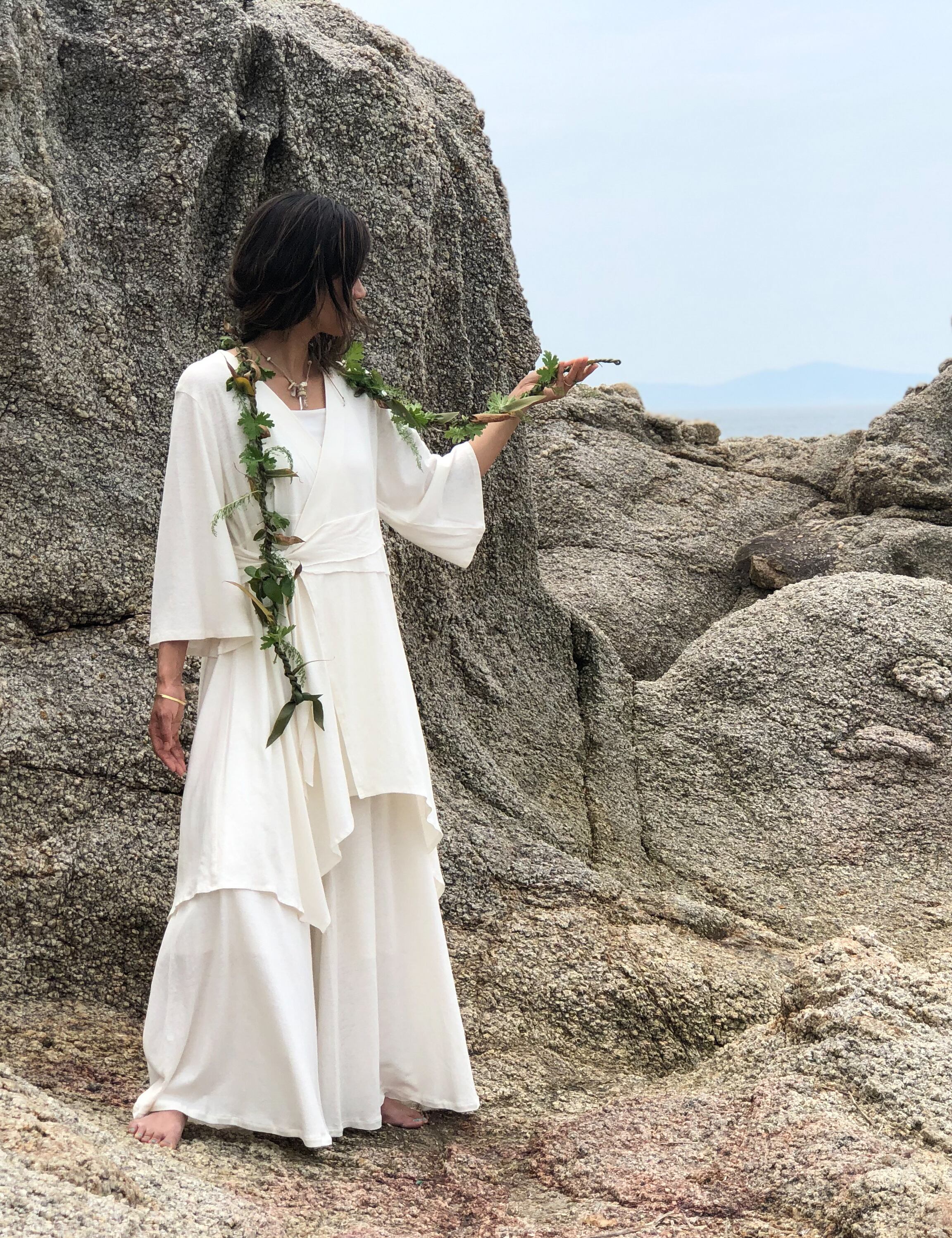 ヘンプ、オーガニックコットンの軽やかな天竺素材で仕立てたカシュクール羽織りは、エレガントで女性らしいシルエットを引き立てます。