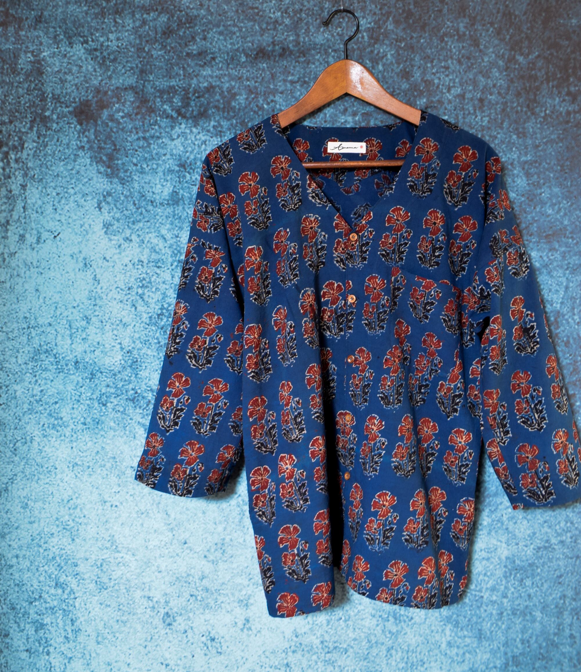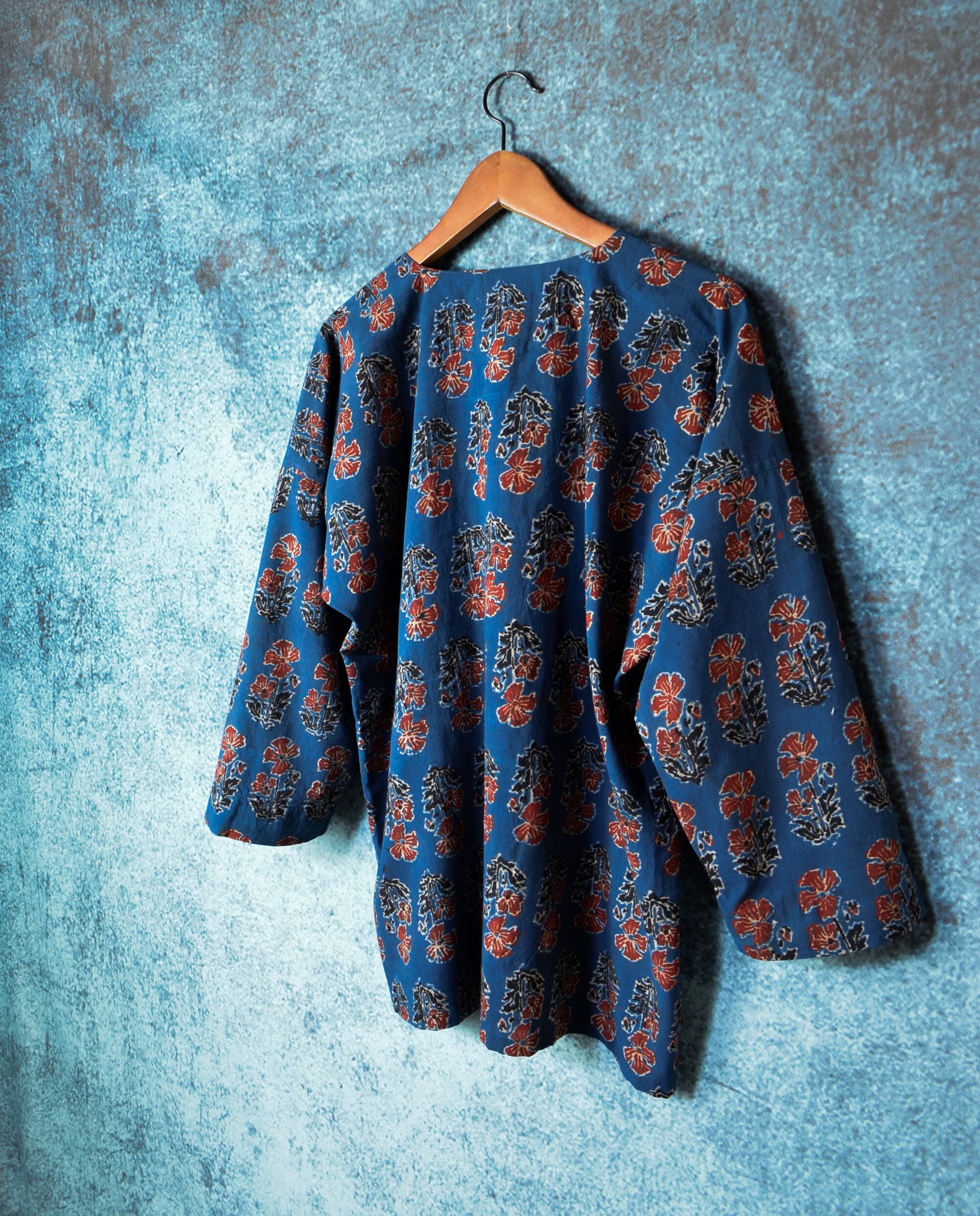 伝統的な日本の服装からインスパイアを受け、インドのしなやかな薄手のブロックプリント生地を鯉口シャツに仕立てました。