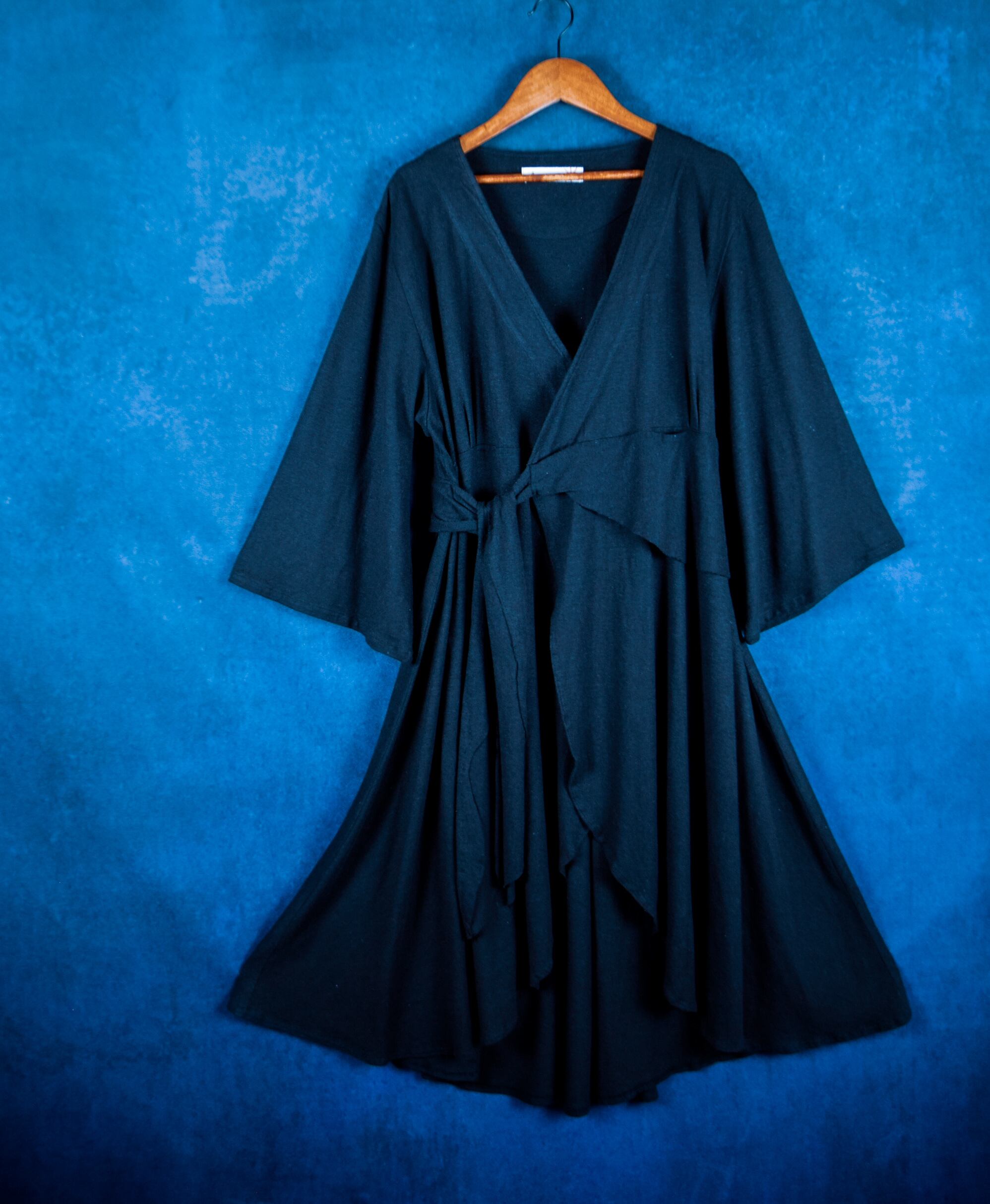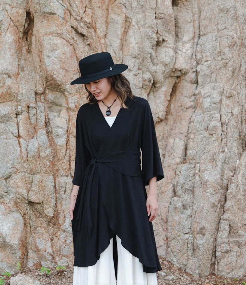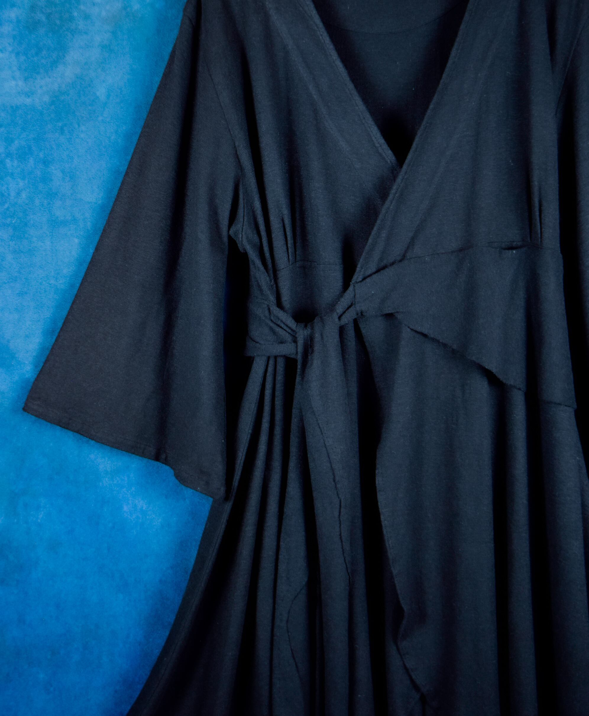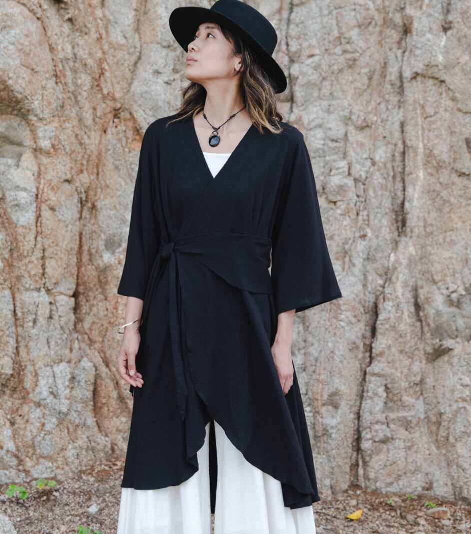 ヘンプ、オーガニックコットンの軽やかな天竺素材で仕立てたカシュクール羽織りは、エレガントで女性らしいシルエットを引き立てます。