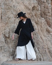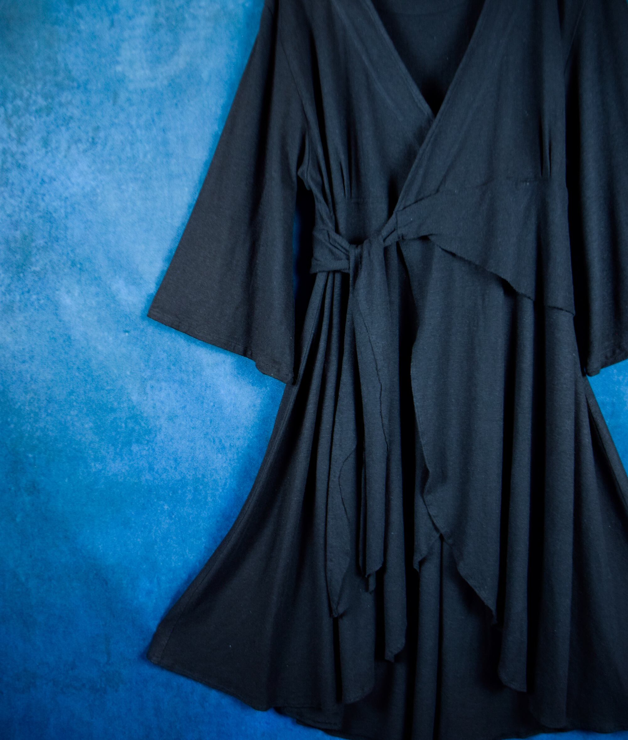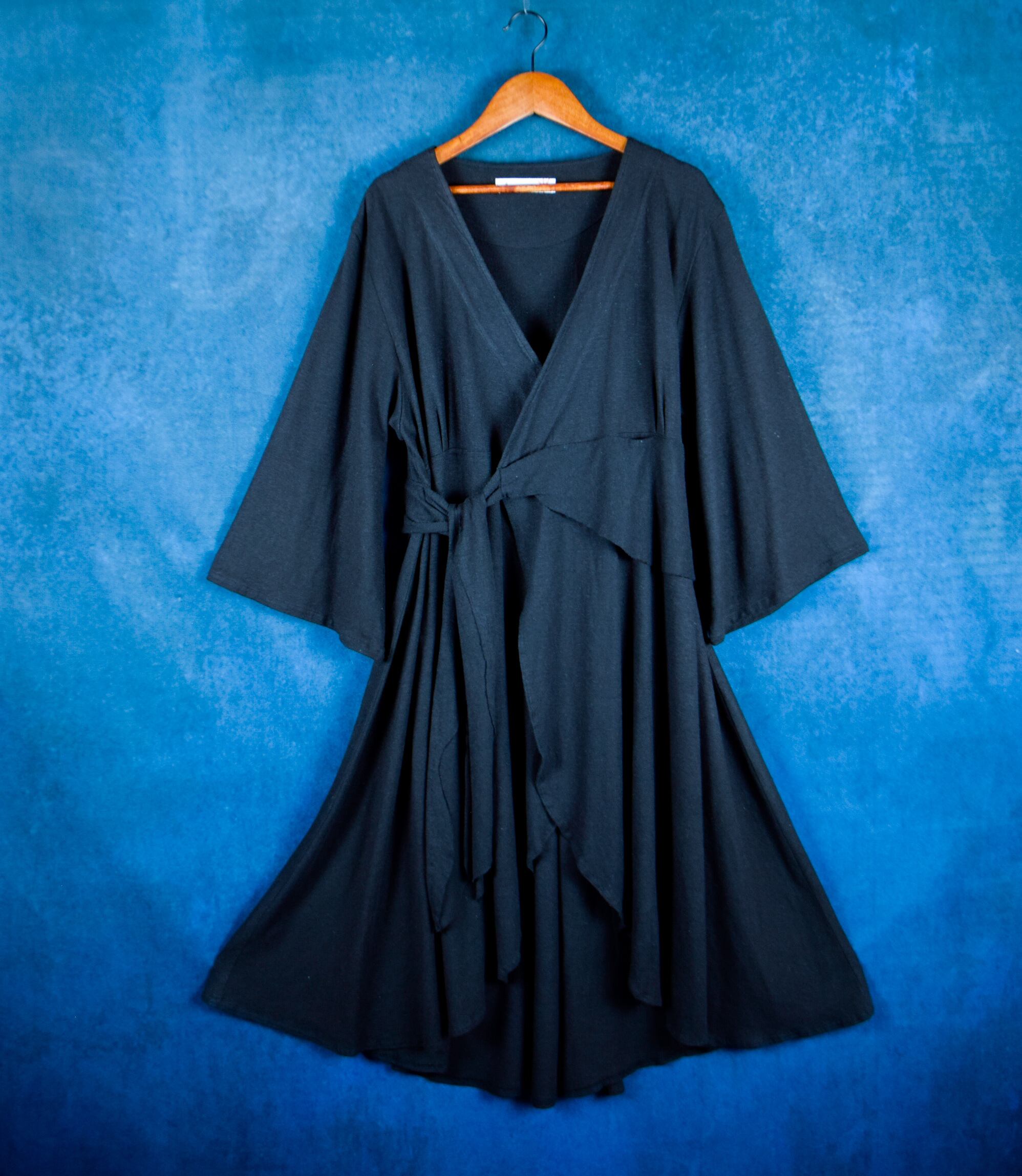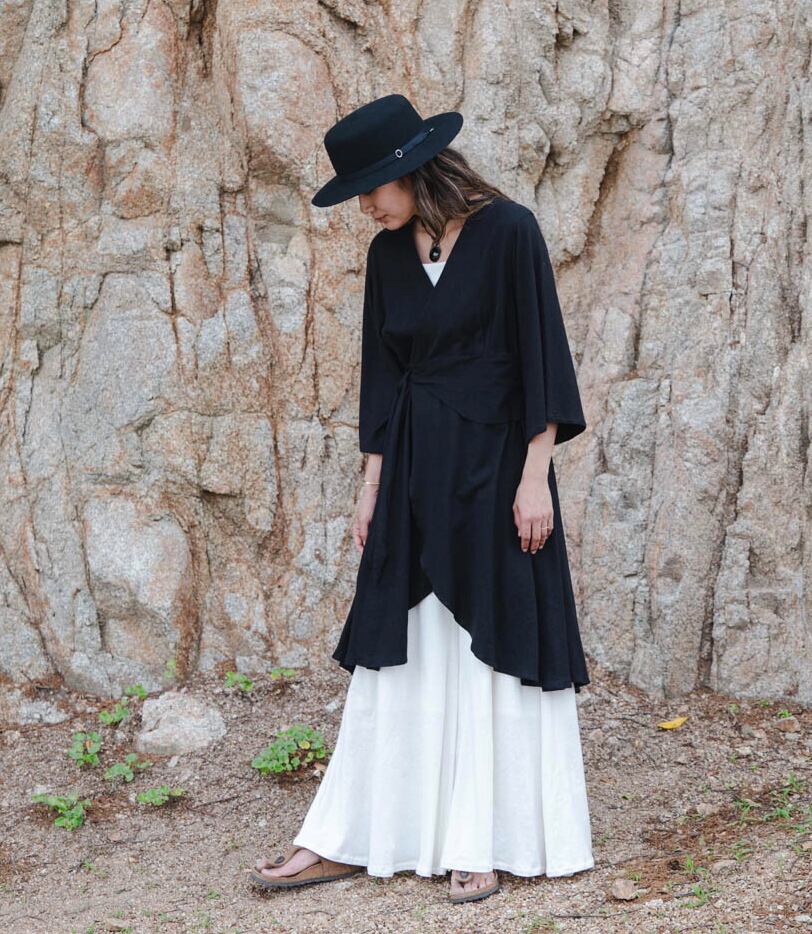ヘンプ、オーガニックコットンの軽やかな天竺素材で仕立てたカシュクール羽織りは、エレガントで女性らしいシルエットを引き立てます。