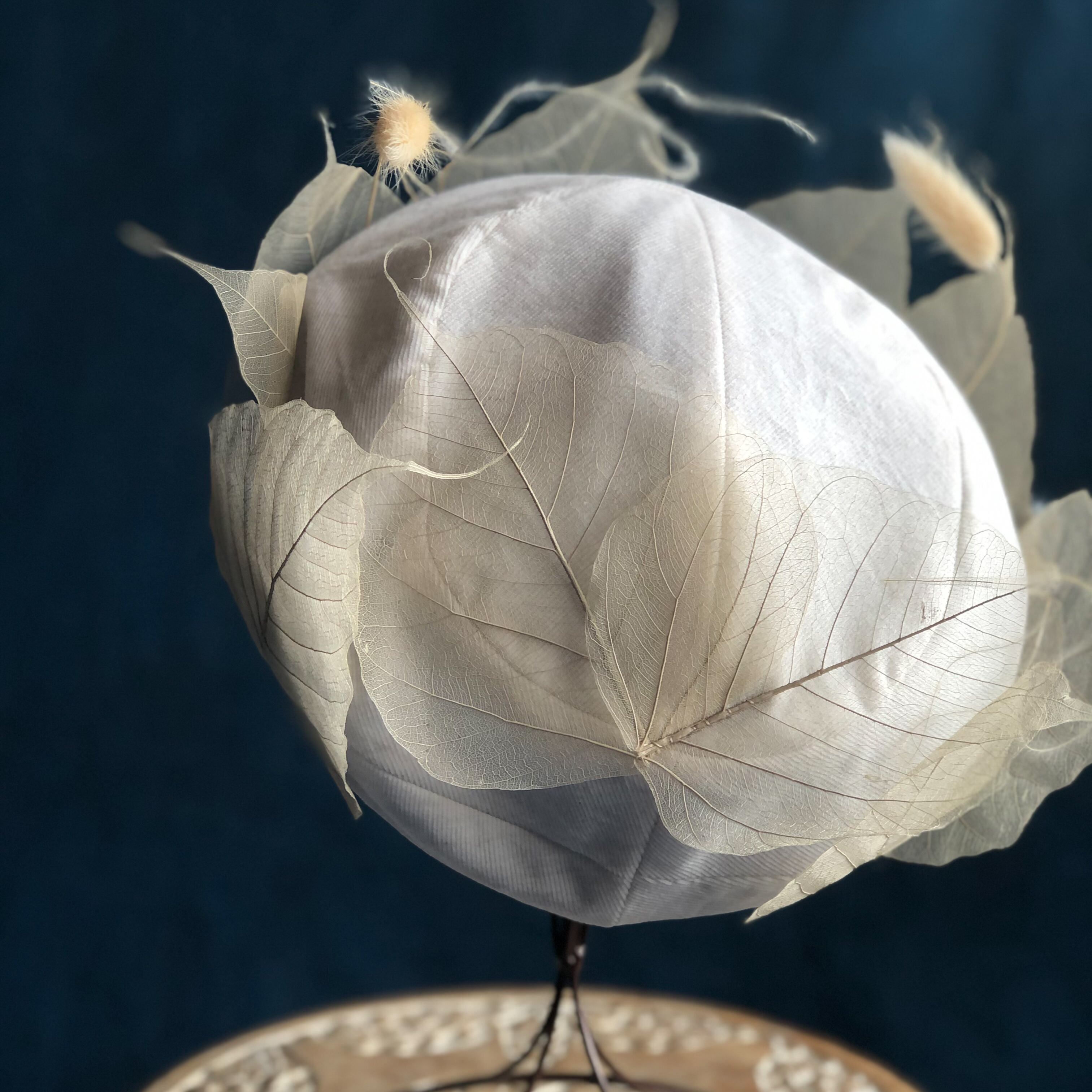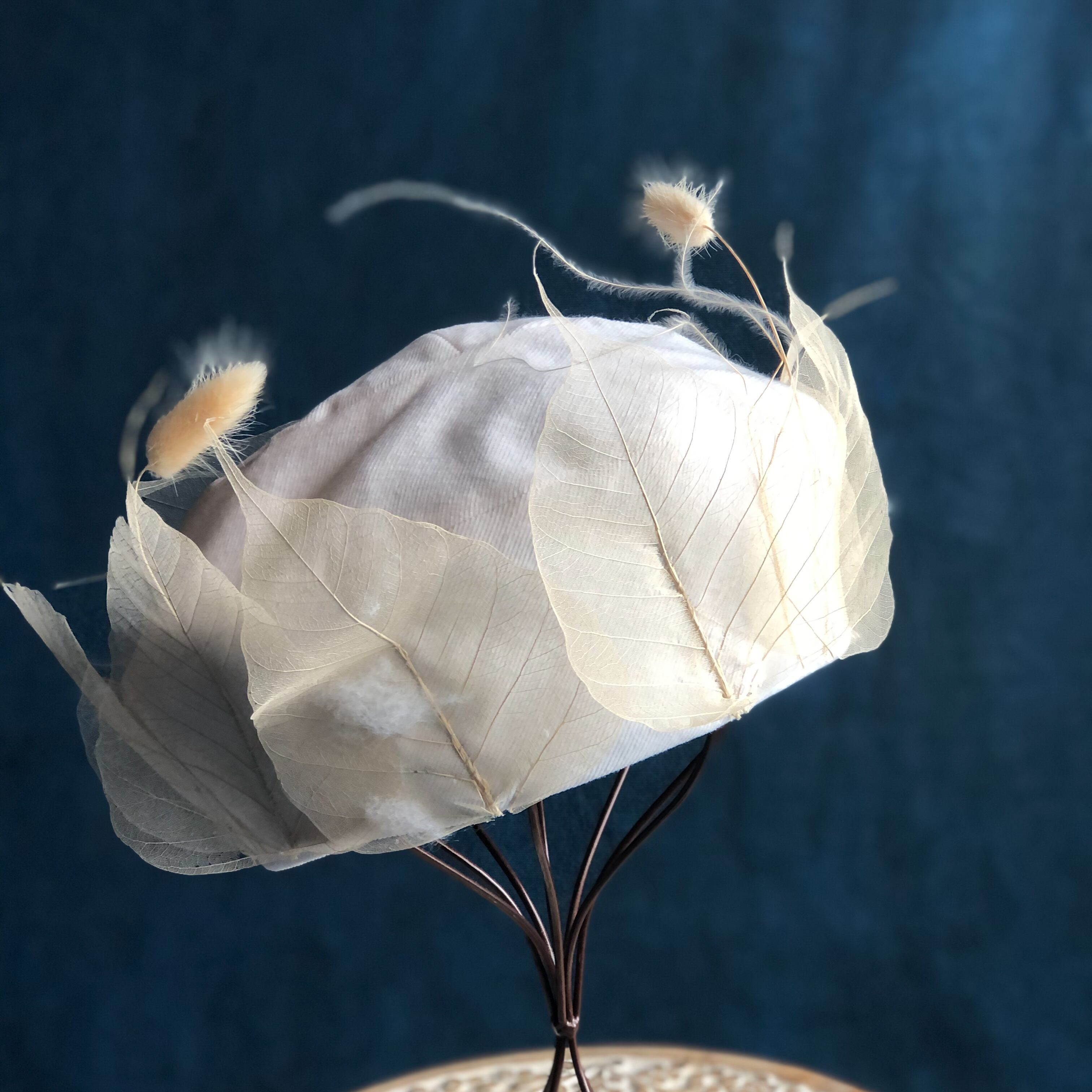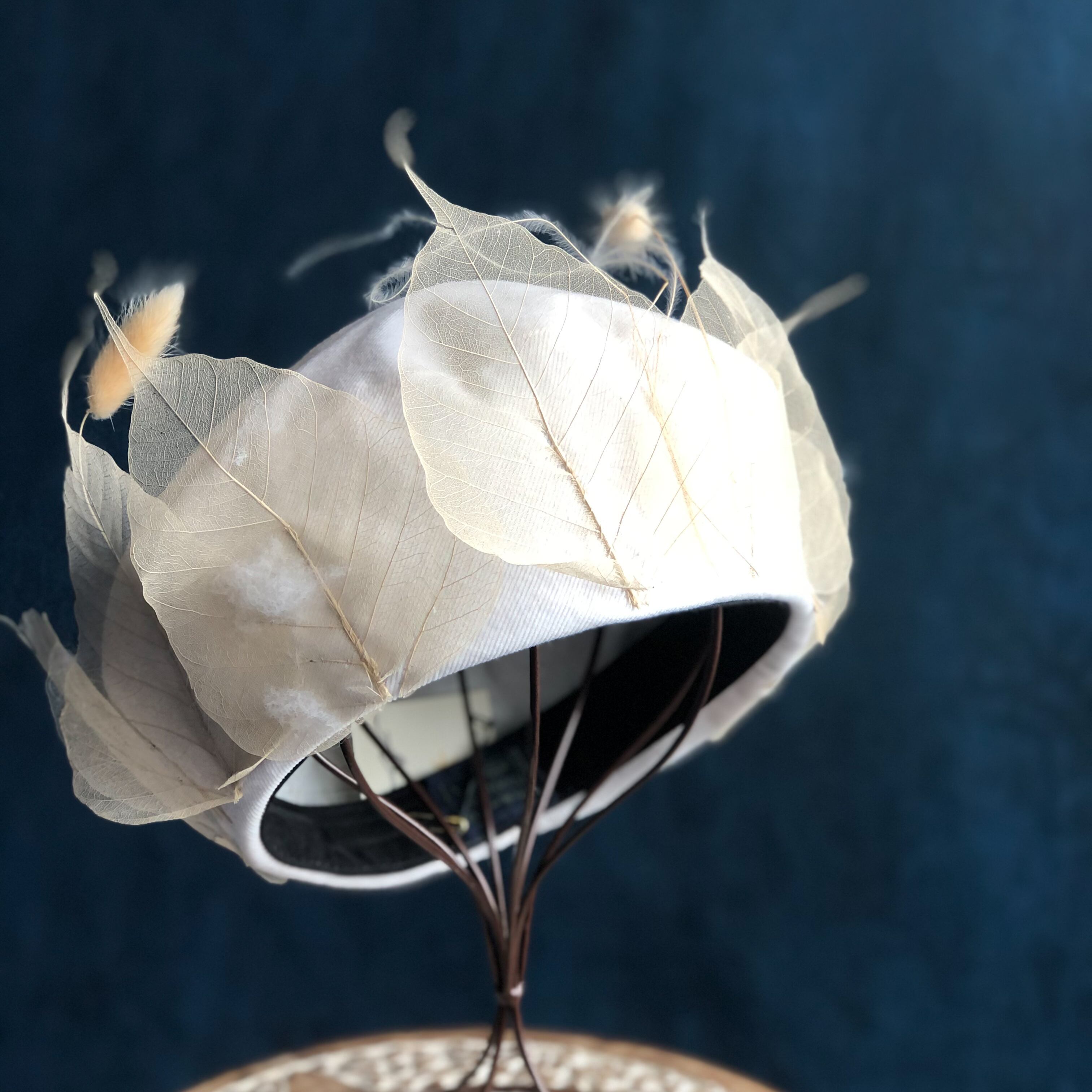 ドライ加工された葉っぱや小花などの植物、ふわふわの綿などが装飾された個性的な一点もののベレー帽。