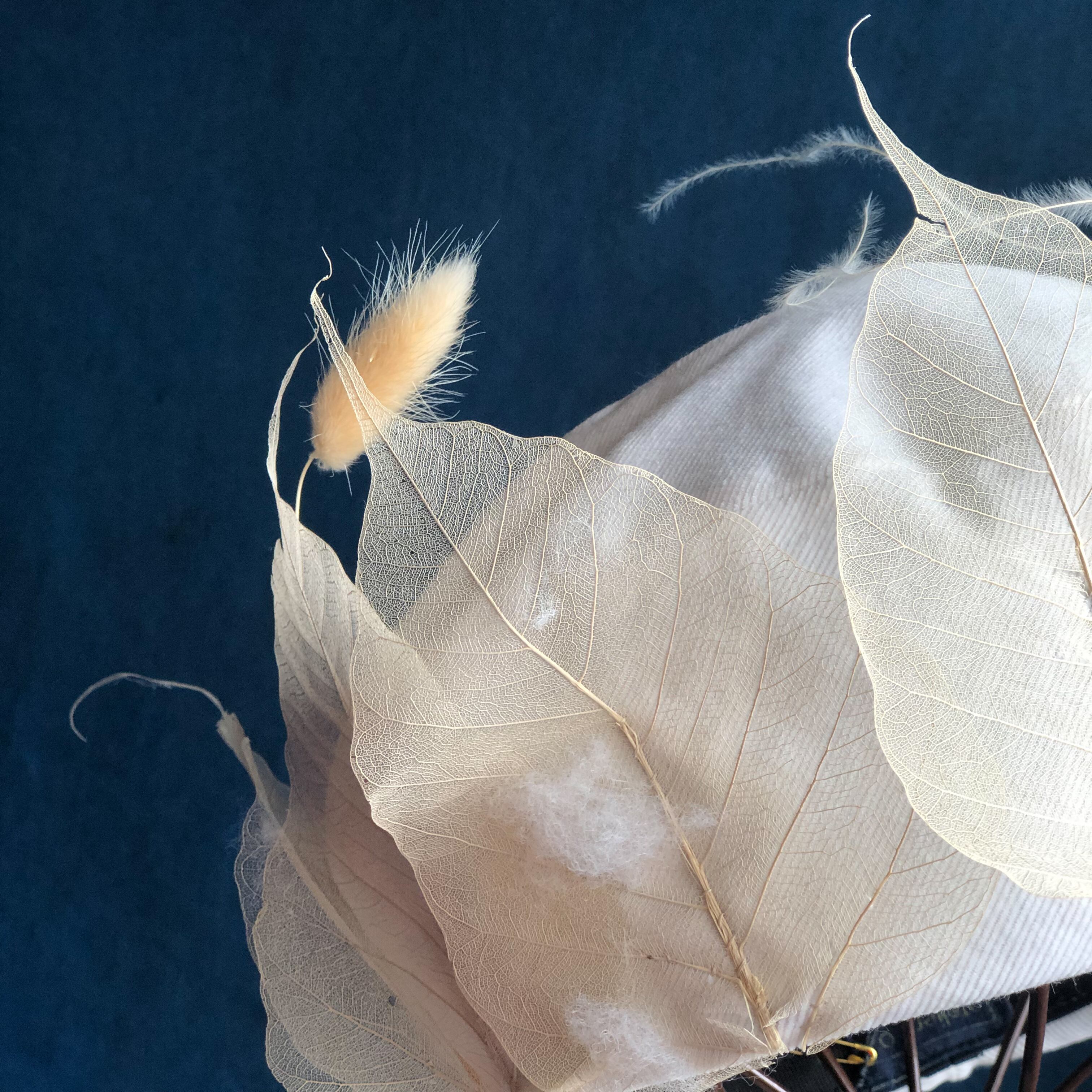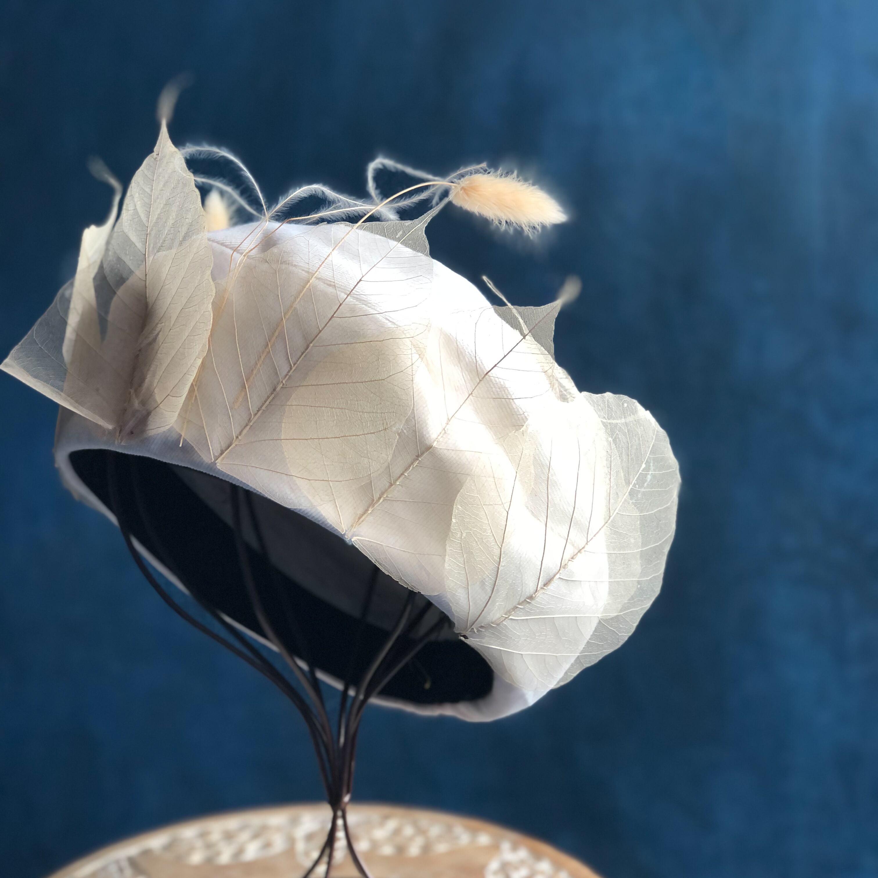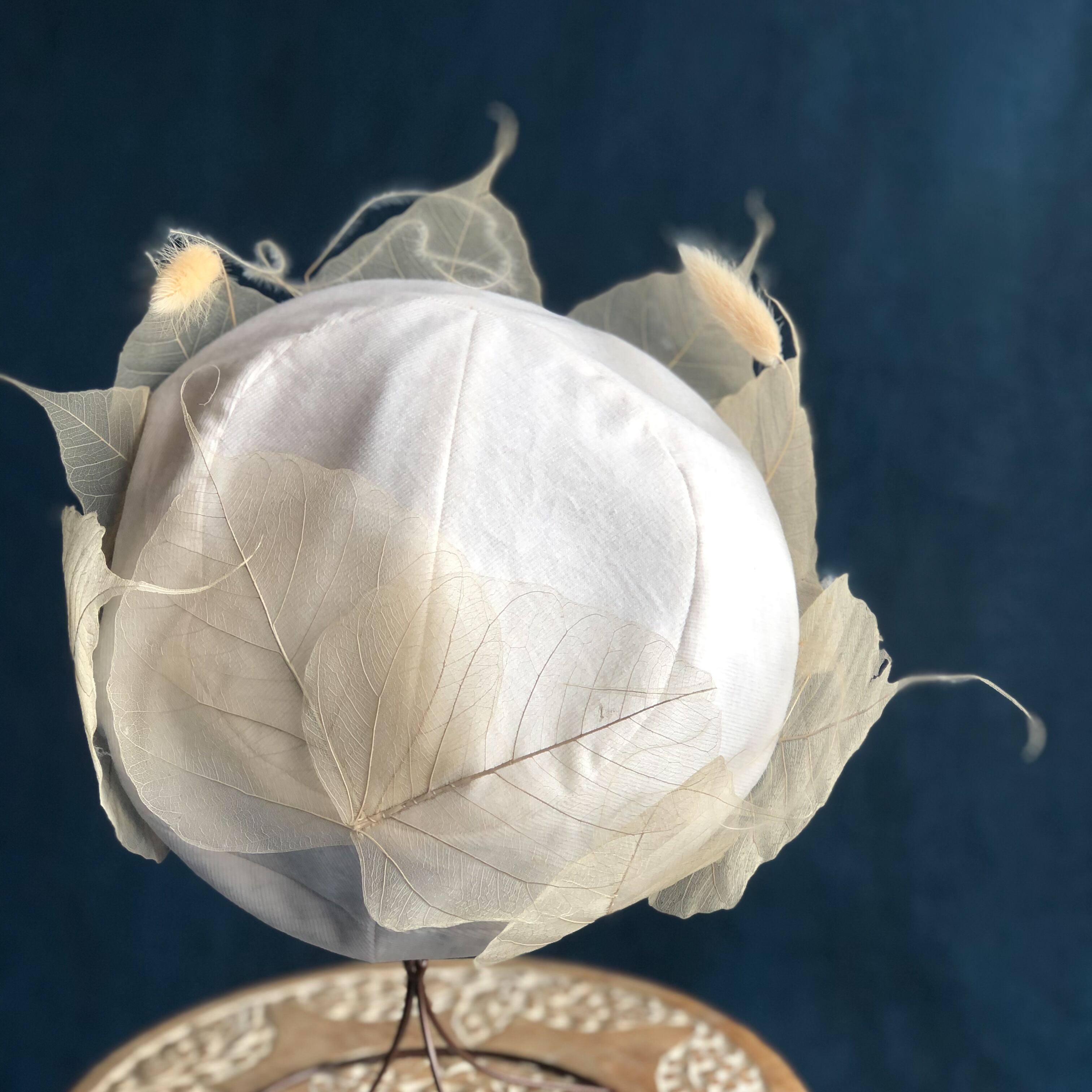 ドライ加工された葉っぱや小花などの植物、ふわふわの綿などが装飾された個性的な一点もののベレー帽。