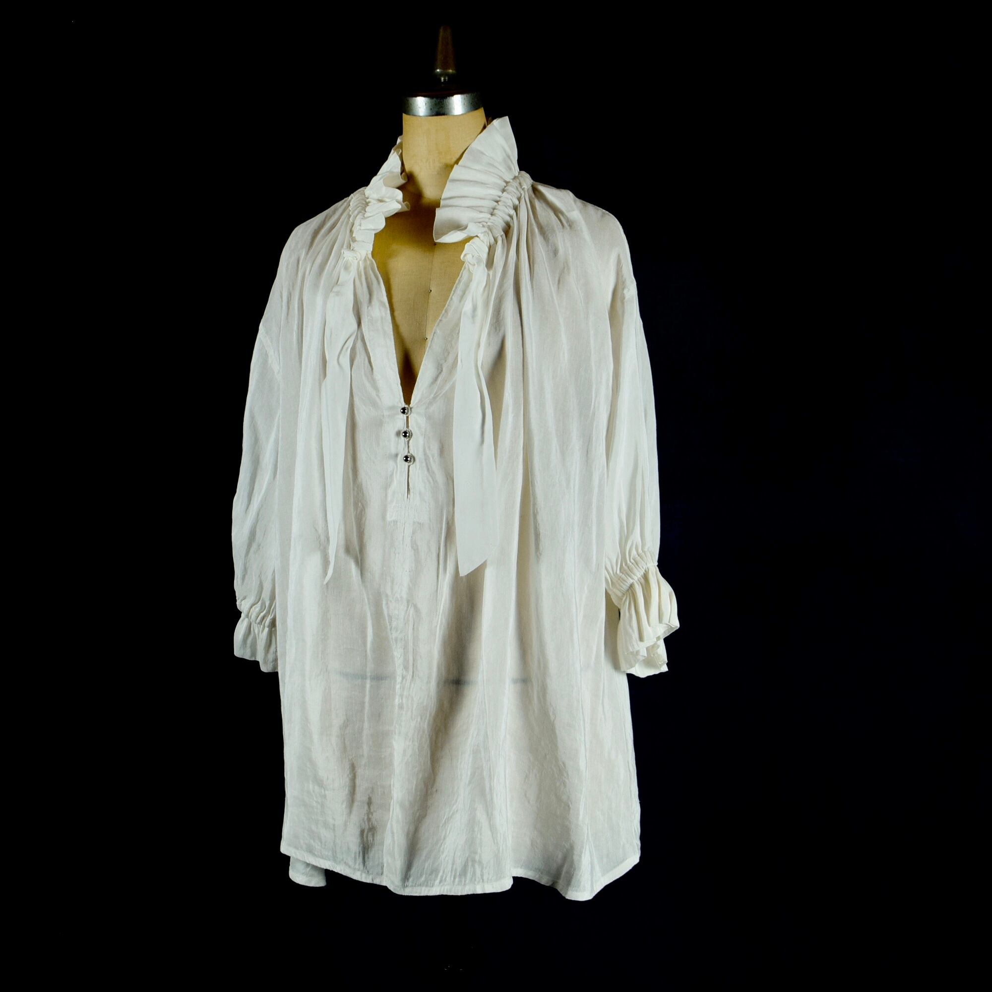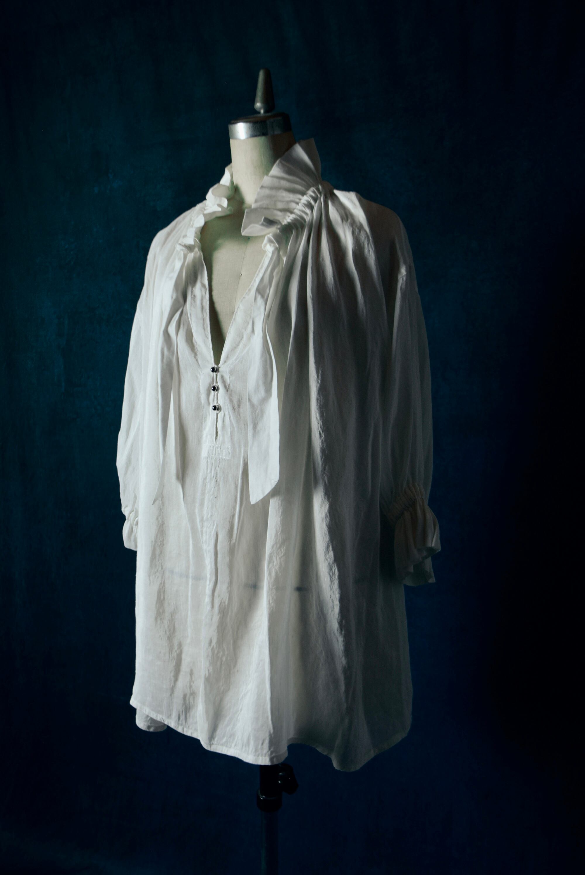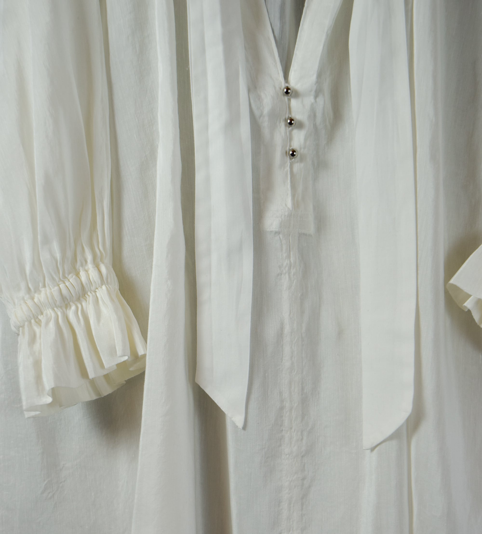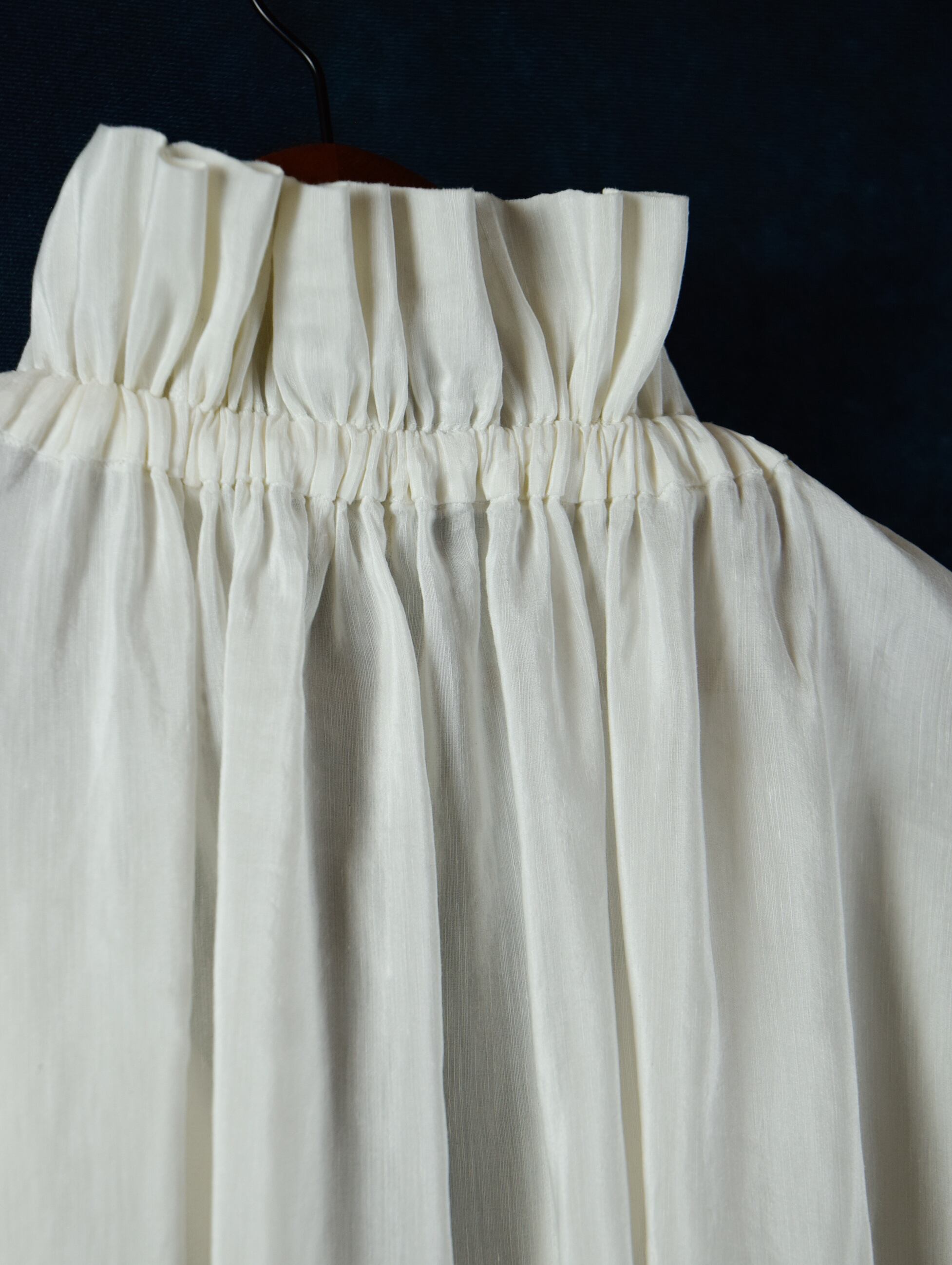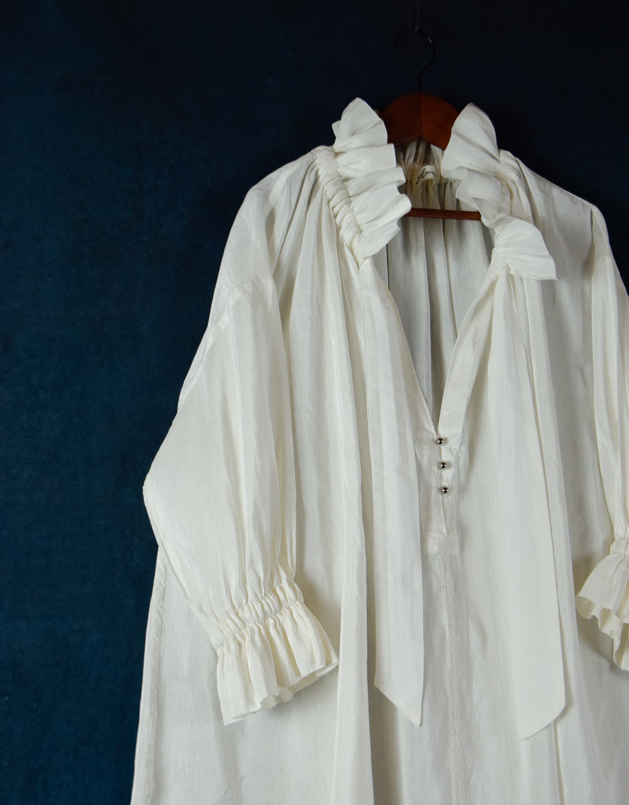 上質な光沢のある薄手のヘンプシルク素材をギャザーとフリルたっぷりとロマンティックでゴージャスな一着に仕立てました。