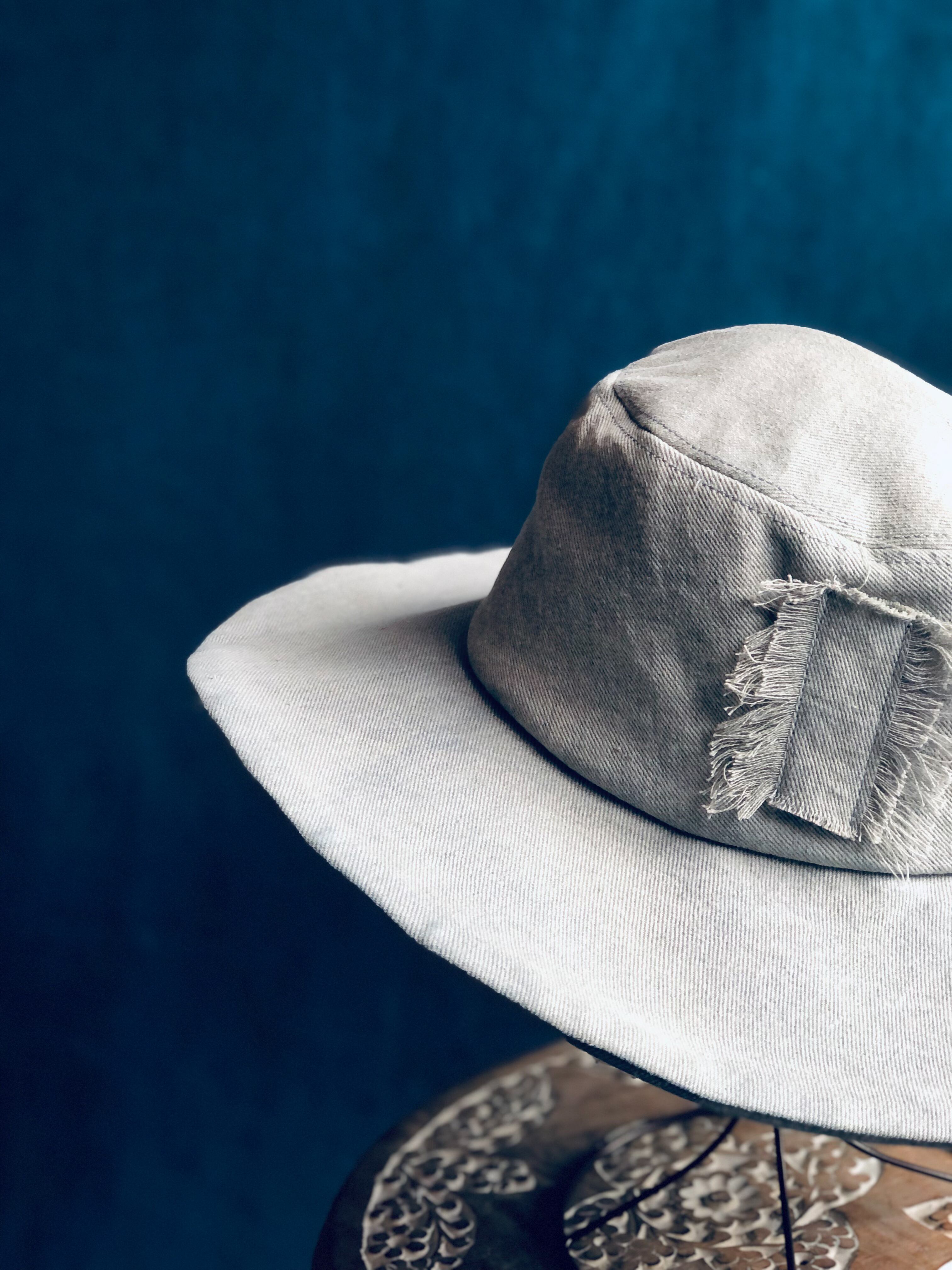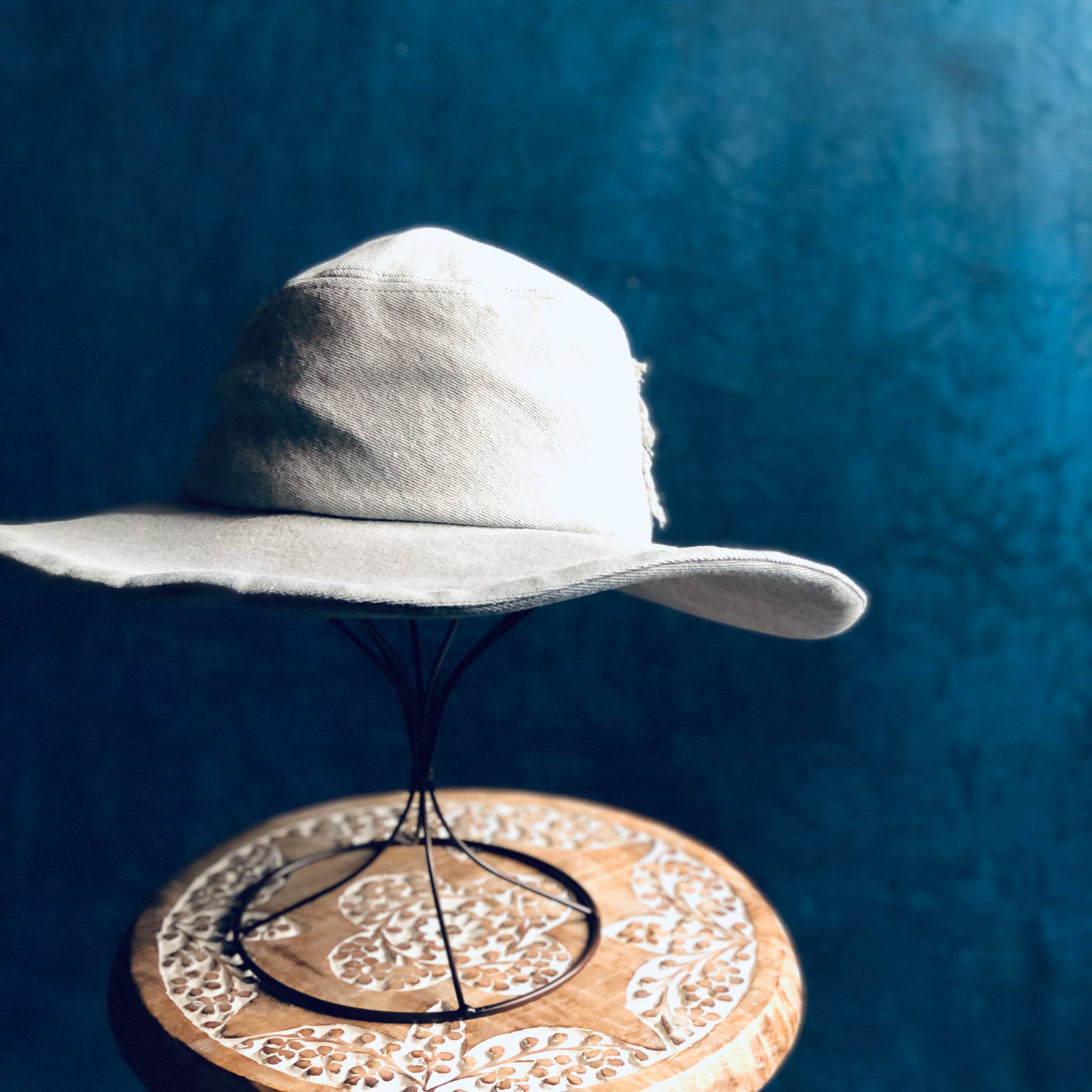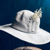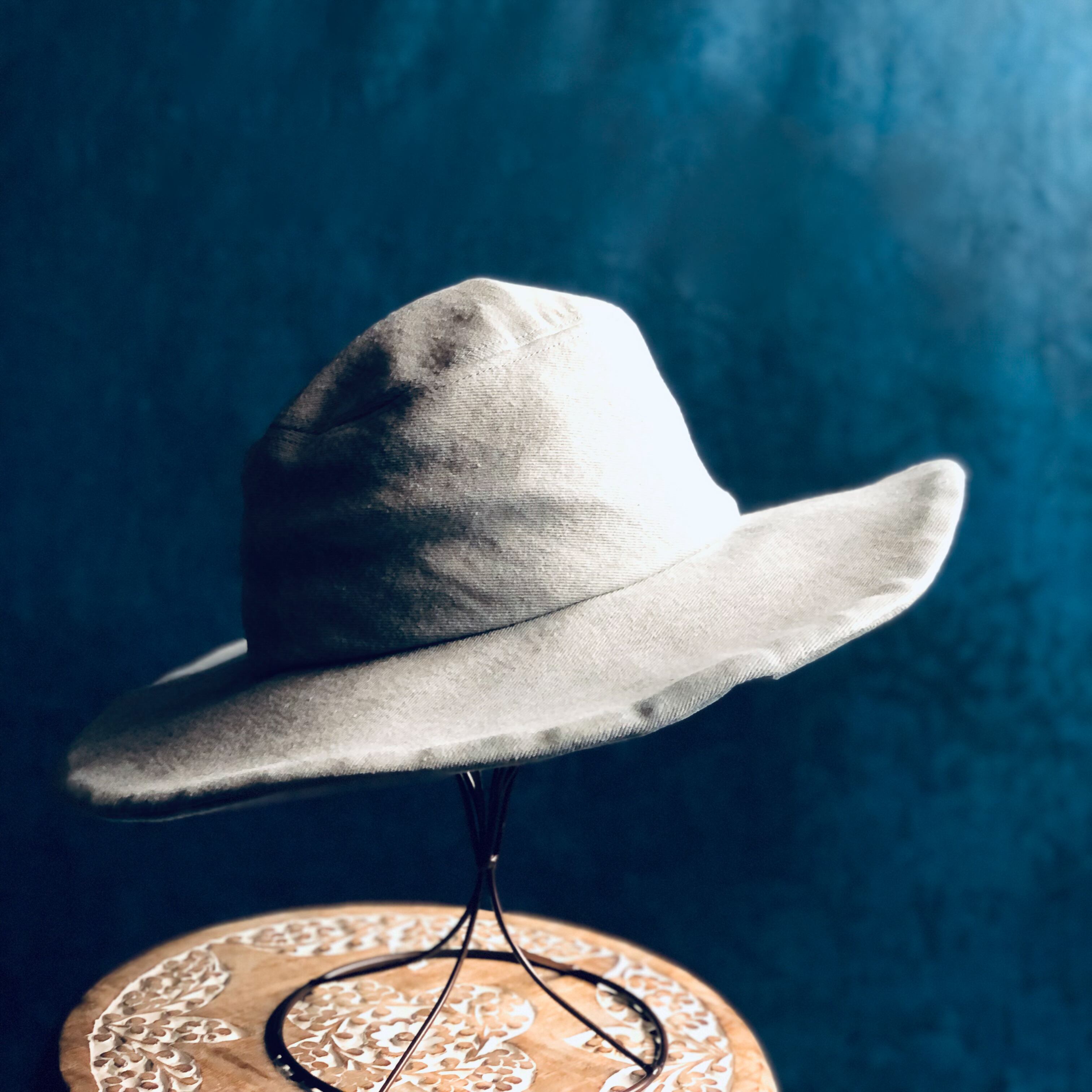 広めのつばがクールな雰囲気をプラスしてくれるリネンハット。クラウントップを平らなシルエットに、甘くなり過ぎないデザインにこだわりました。