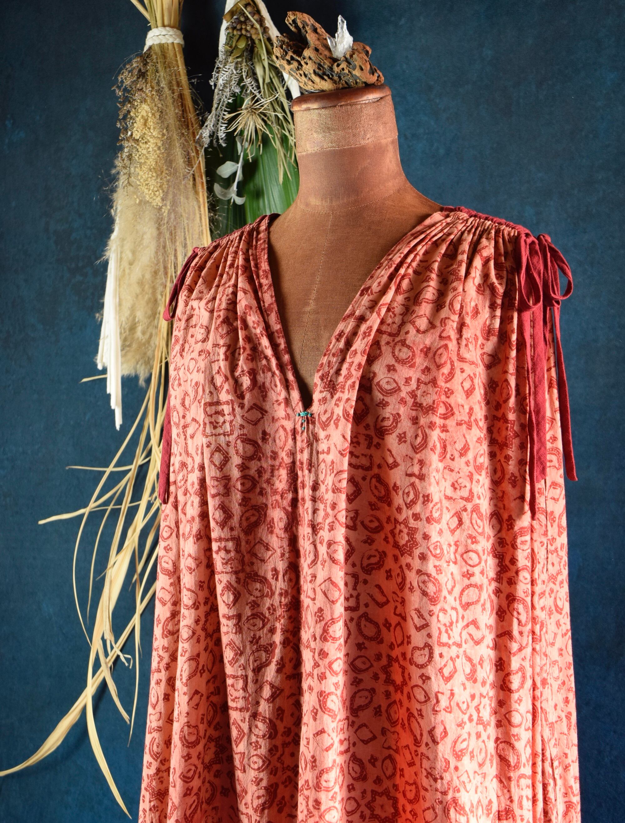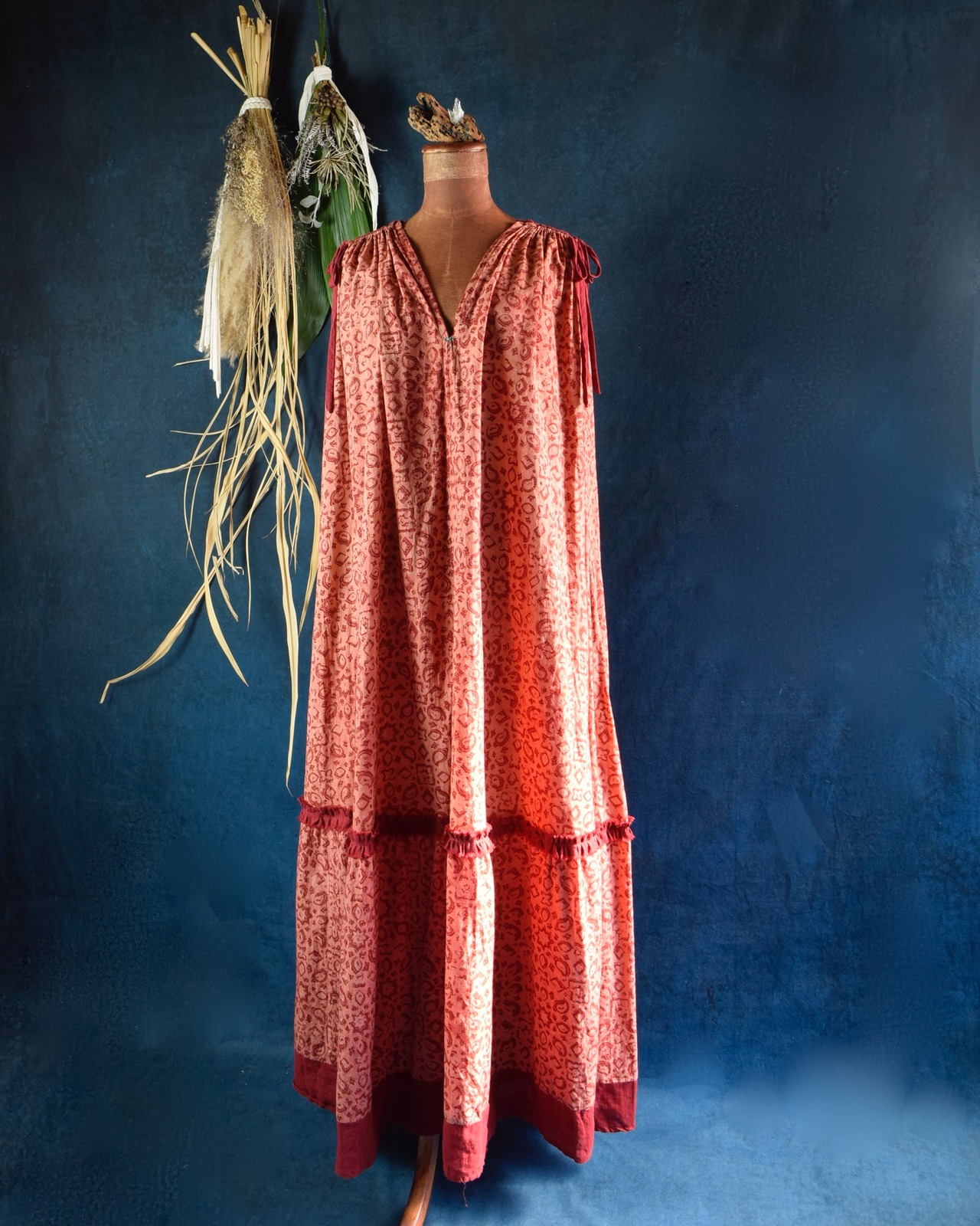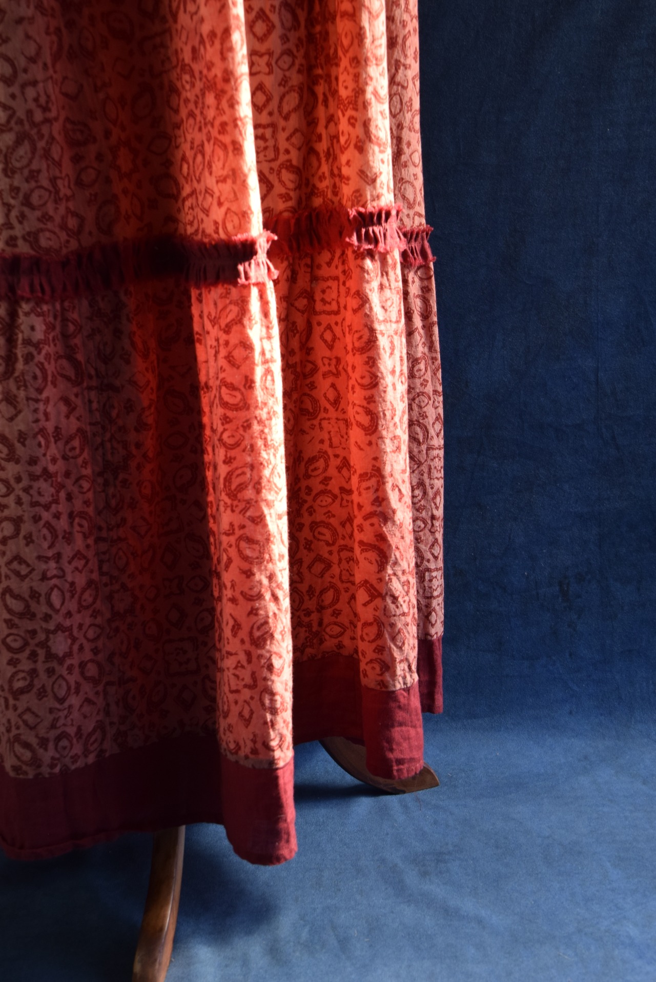 インドの美しい手仕事でブロックプリントを施された、大変薄くしなやかなコットン100%の生地をたっぷりと使用してお仕立てしたギャザーワンピースドレス。