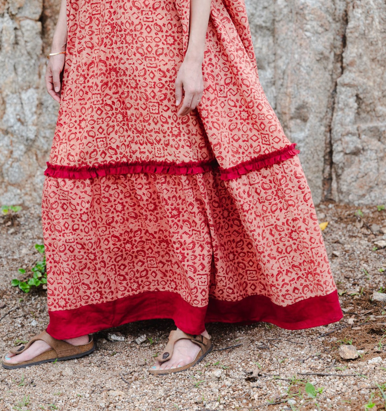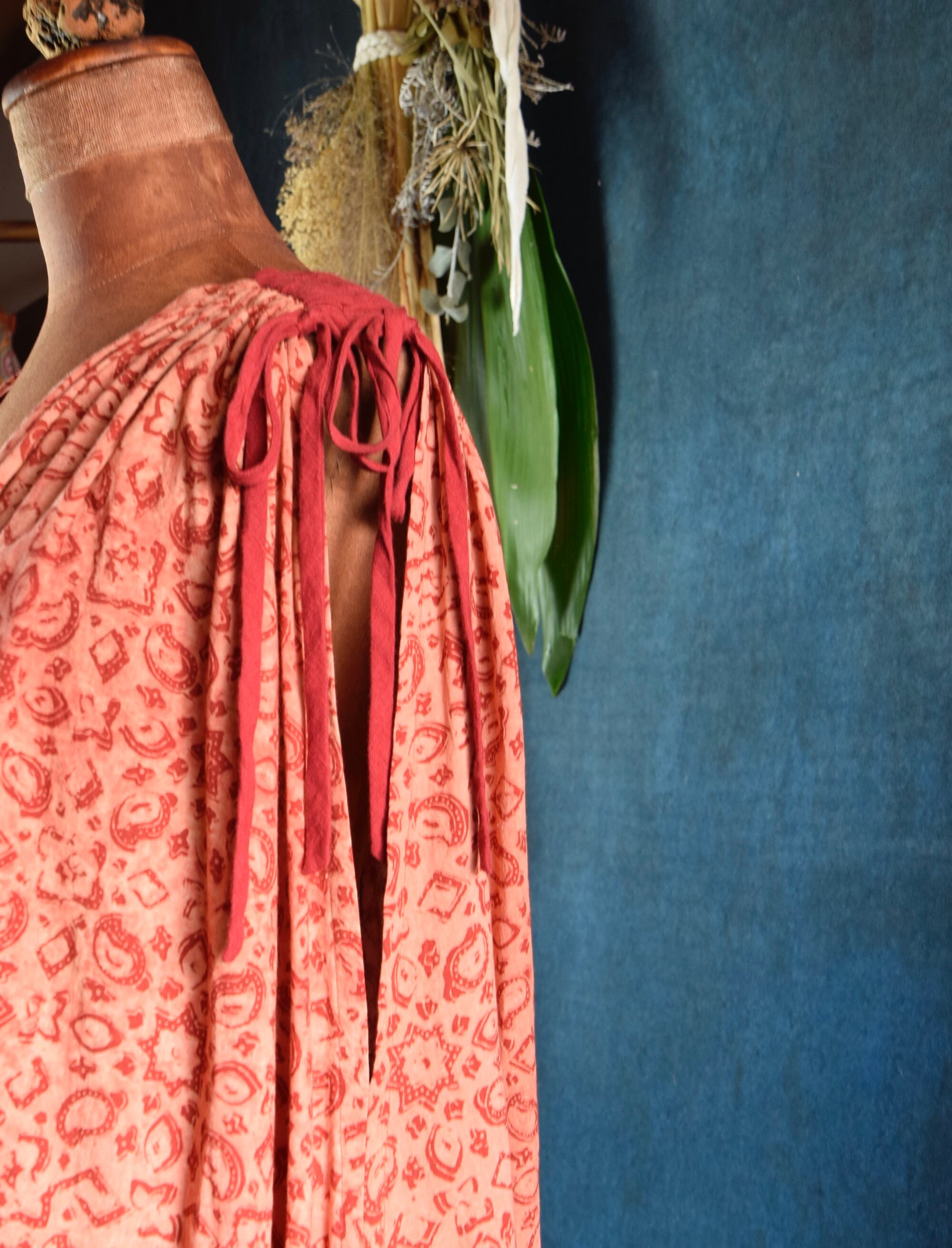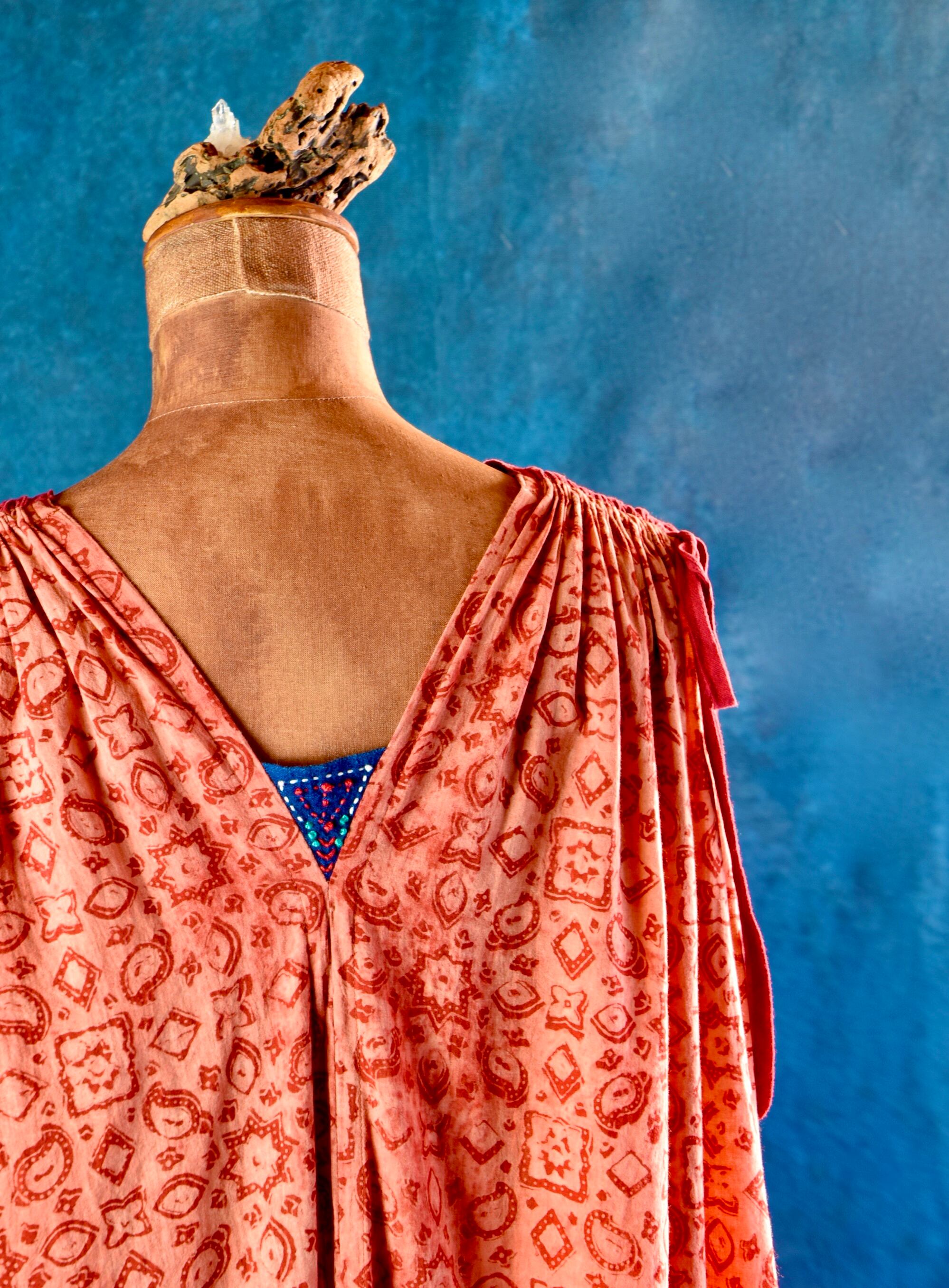 インドの美しい手仕事でブロックプリントを施された、大変薄くしなやかなコットン100%の生地をたっぷりと使用してお仕立てしたギャザーワンピースドレス。