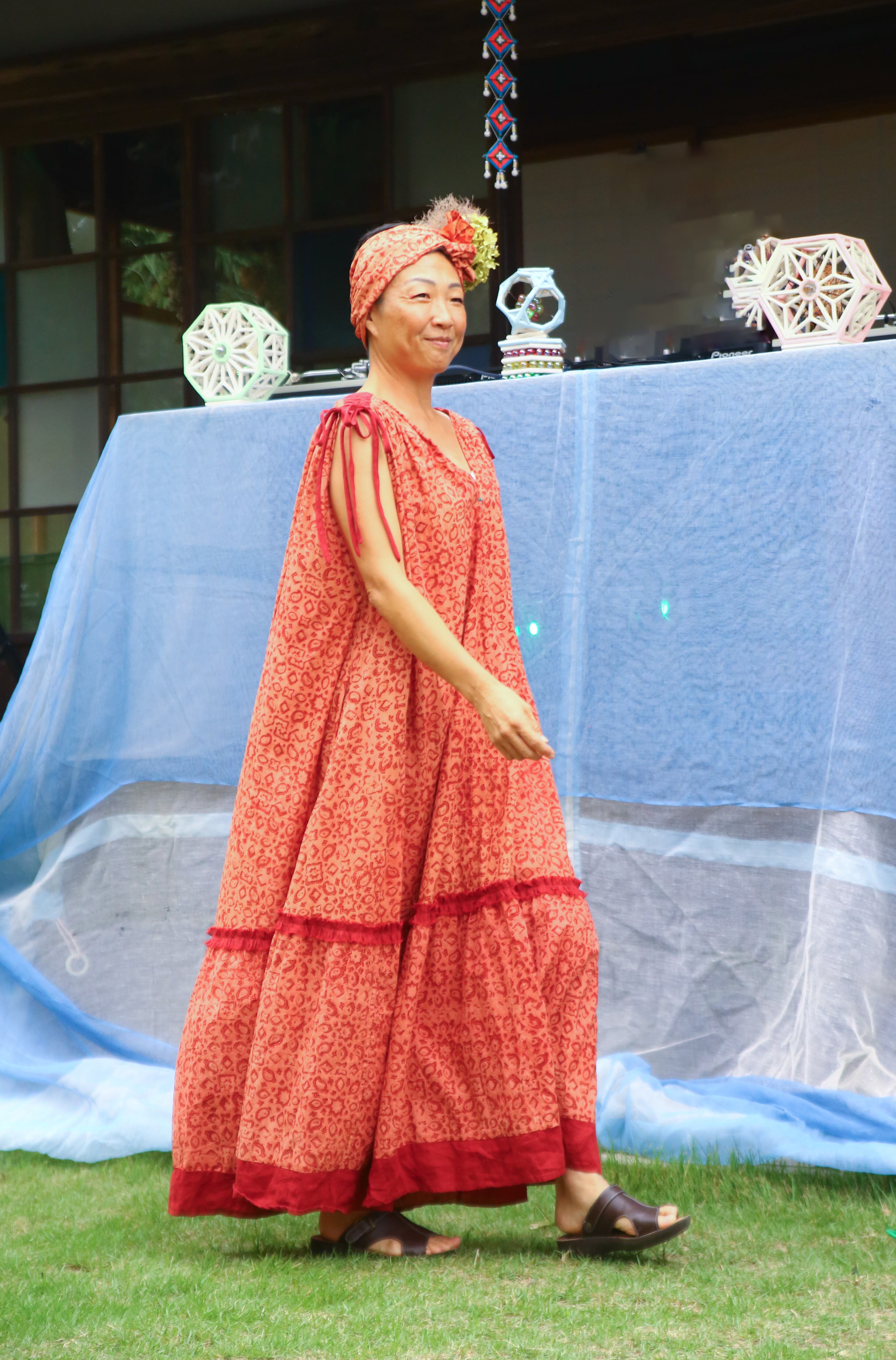 部分的にリネン100%の無地生地を合わせ、フリルやリボンでポイントを持たせたデザインで、後ろの襟元にも藍染布を用いた、背守りの刺繍のポイントを施しています。